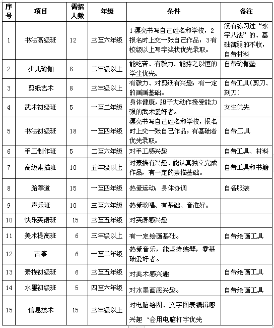 一、请参加2021年暑期培训的美术卡通班、象棋初级班、象棋高级班、二胡、莆仙戏曲、电子琴、素描初级班、葫芦丝、乒乓球、舞蹈、琵琶、印染班、书法高级班、少儿瑜伽、剪纸艺术、武术初级班、手工制作班、高级素描班、声乐班、美术提高班、古筝、水墨画初级班等项目的旧生根据课程安排表(见附件1),于11月6日起准时到活动中心上课,并配合中心做好《告家长书》的签定工作。