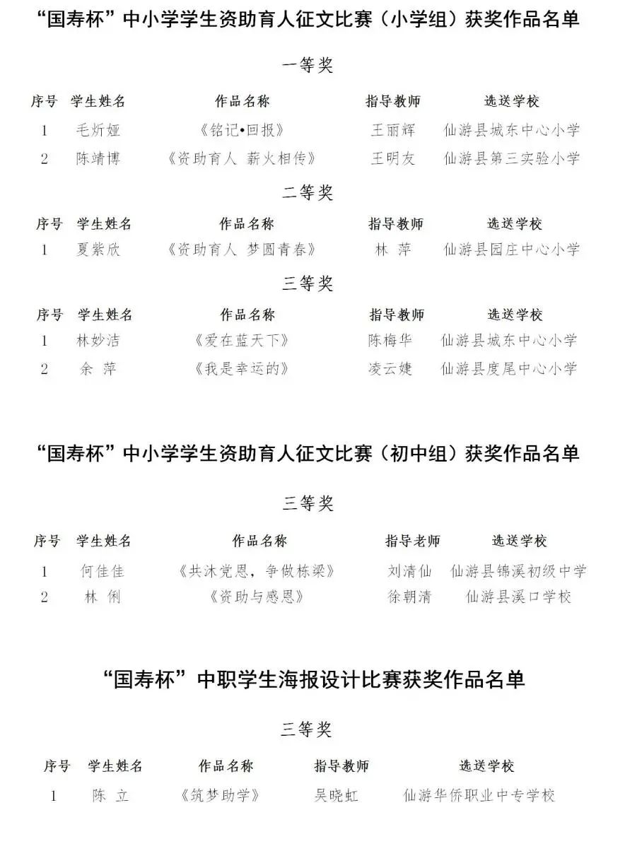根据《莆田市教育局关于开展“讲好资助故事 献礼建党百年”资助育人宣传活动的通知》(莆教直〔2021〕9号)的文件精神,莆田市教育局、中国人寿保险股份有限公司莆田分公司联合在全市中小学校(中等职业学校、幼儿园)组织开展“国寿小画家”少儿绘画比赛活动 、“国寿杯”中小学学生资助育人征文及中职学生海报设计评选活动。在各县区(管委会)教育局(事务局)和学校择优推荐基础上,经组织专家评审,评选出“国寿小画家”少儿绘画比赛(儿童组)获奖作品一等奖6幅、二等奖10幅、三等奖16幅、优秀奖108幅;“国寿小画家”少儿绘画比赛(少年组)获奖作品一等奖6幅、二等奖10幅、三等奖16幅、优秀奖28幅;“国寿杯”中小学学生资助育人征文比赛获奖作文共60篇,其中小学组、初中组、高中组一等奖各4篇、二等奖各6篇、三等奖各10篇;“国寿杯”中职学生海报设计比赛获奖作品一等奖4幅、二等奖6幅、三等奖10幅。现将获奖作品名单予以公布(详见附件,同一等次作品排名不分先后)。