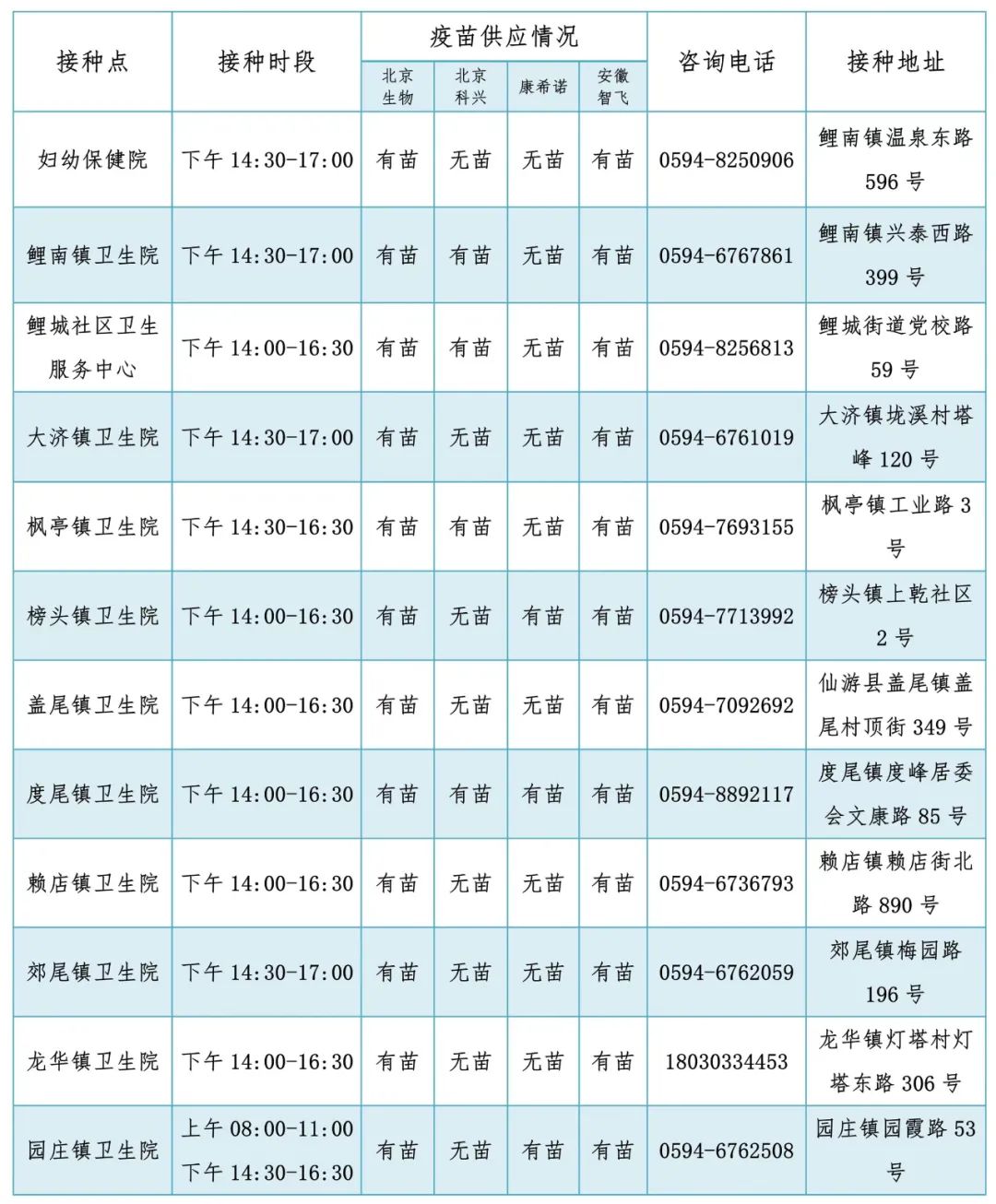 2022年12月3日仙游县开通全民新冠病毒疫苗接种点提醒如下: