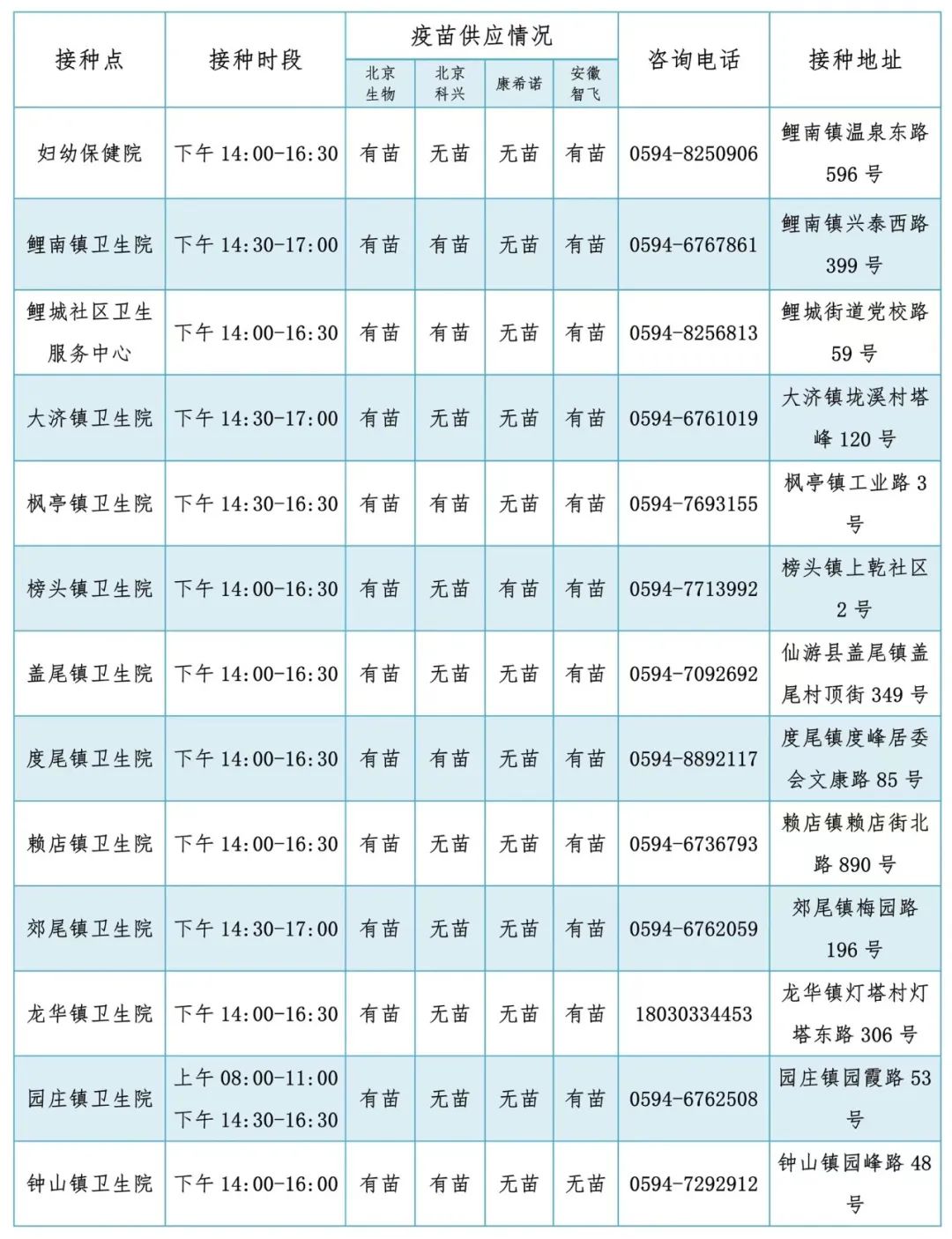 2022年12月9日仙游县开通全民新冠病毒疫苗接种点提醒如下: