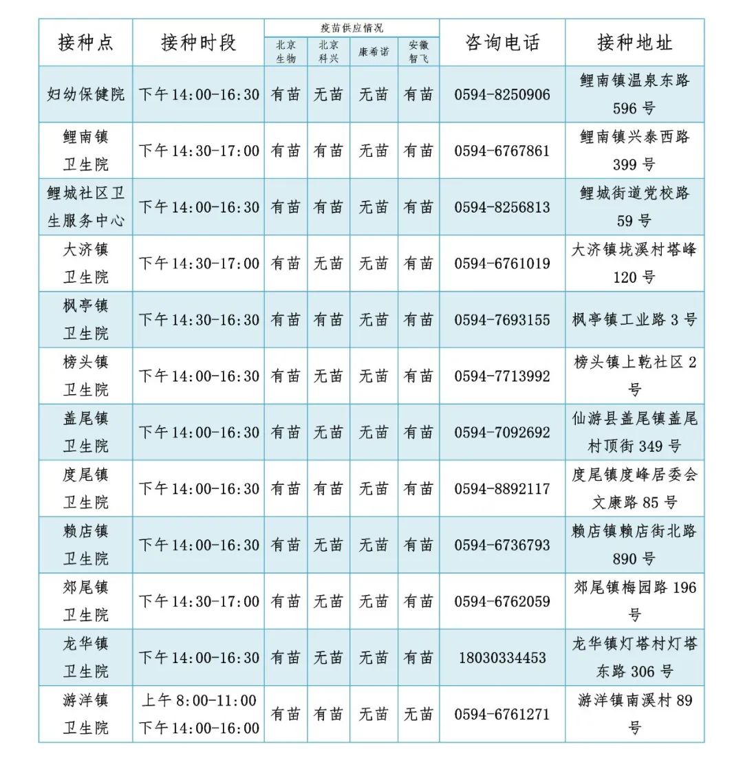 2022年12月10日仙游县开通全民新冠病毒疫苗接种点提醒如下: