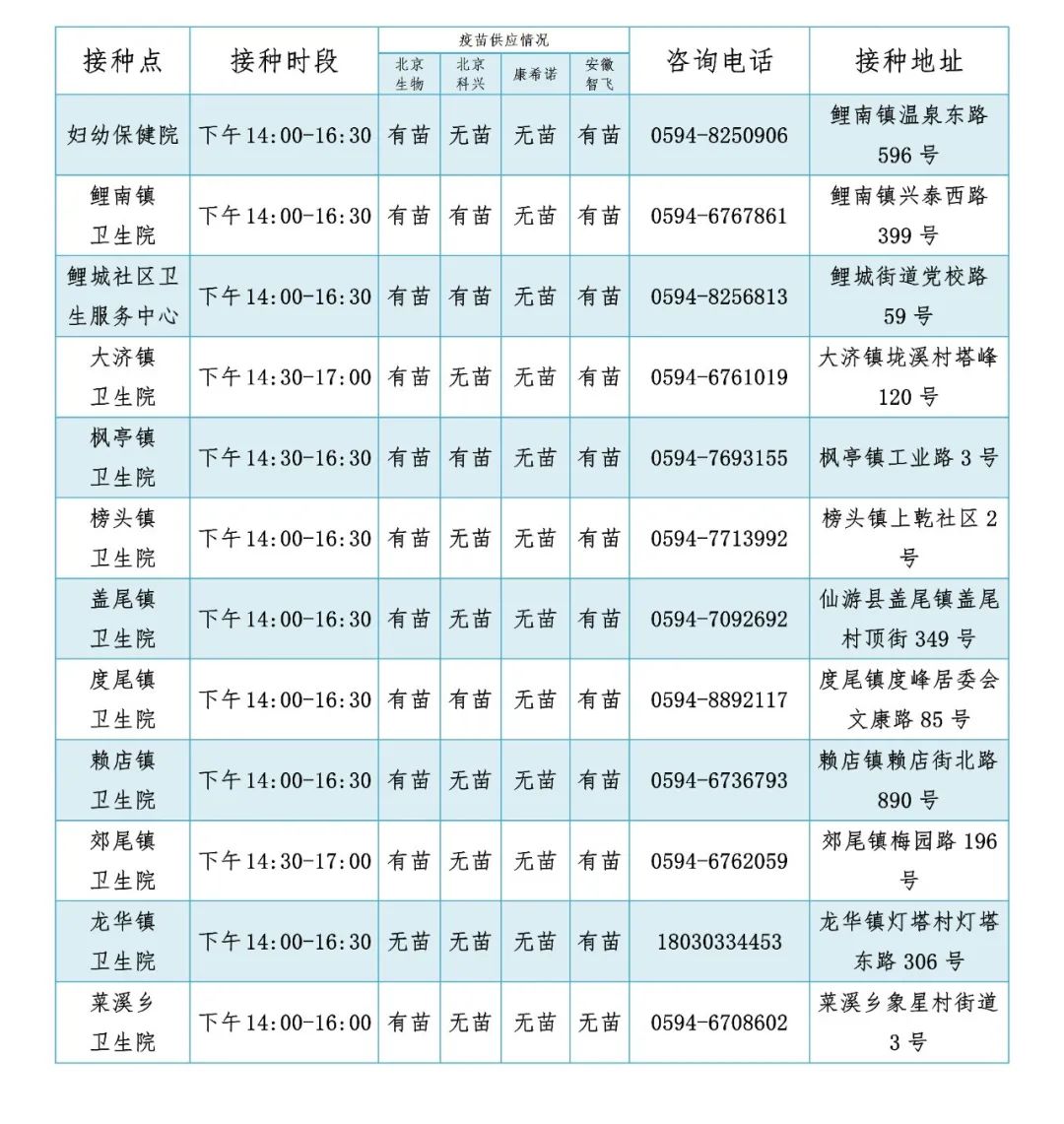 2022年12月12日仙游县开通全民新冠病毒疫苗接种点提醒如下: