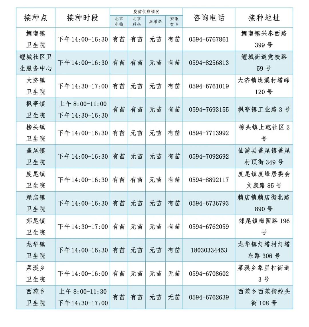 2022年12月14日仙游县开通全民新冠病毒疫苗接种点提醒如下: