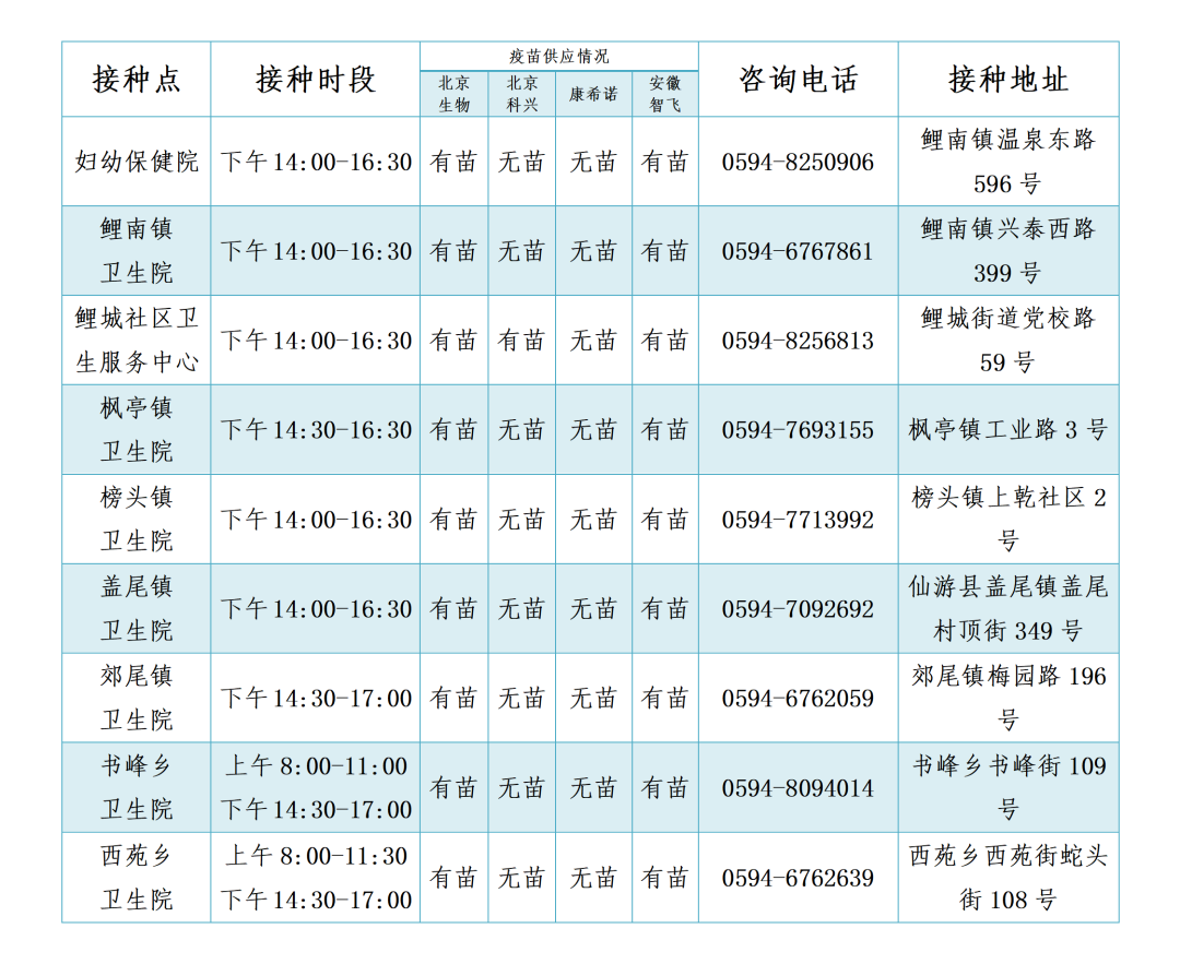 2022年12月26日仙游县开通全民新冠病毒疫苗接种点提醒如下: