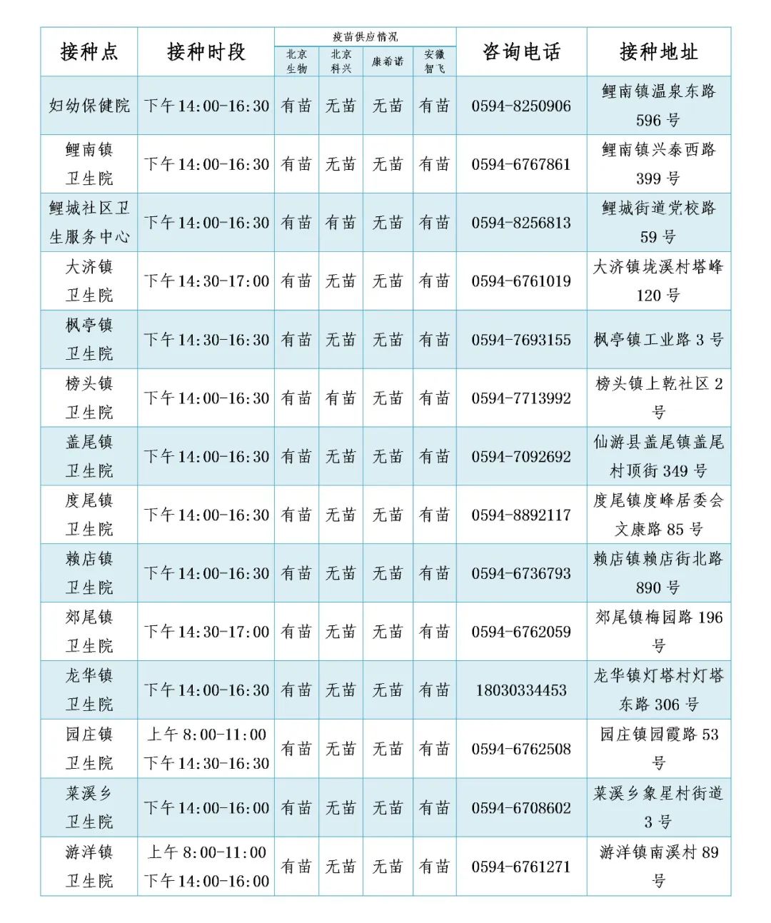 2023年1月7日仙游县开通全民新冠病毒疫苗接种点提醒如下: