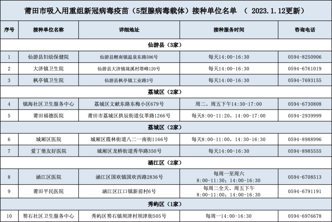 莆田市吸入式新冠病毒疫苗接种单位名单
