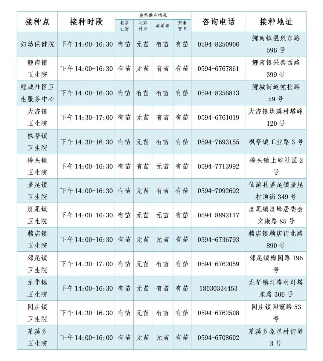 2023年1月18日仙游县开通全民新冠病毒疫苗接种点提醒如下: