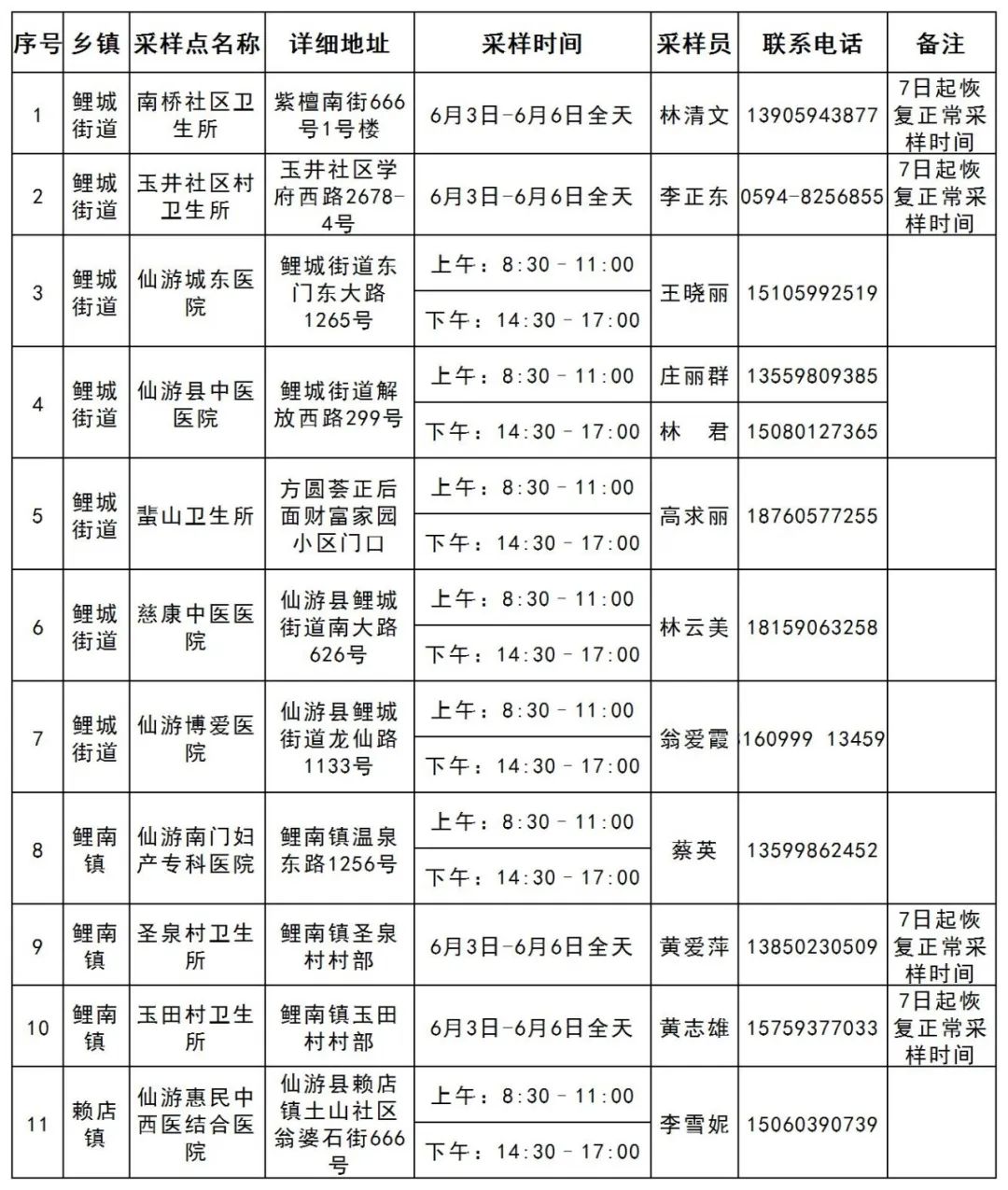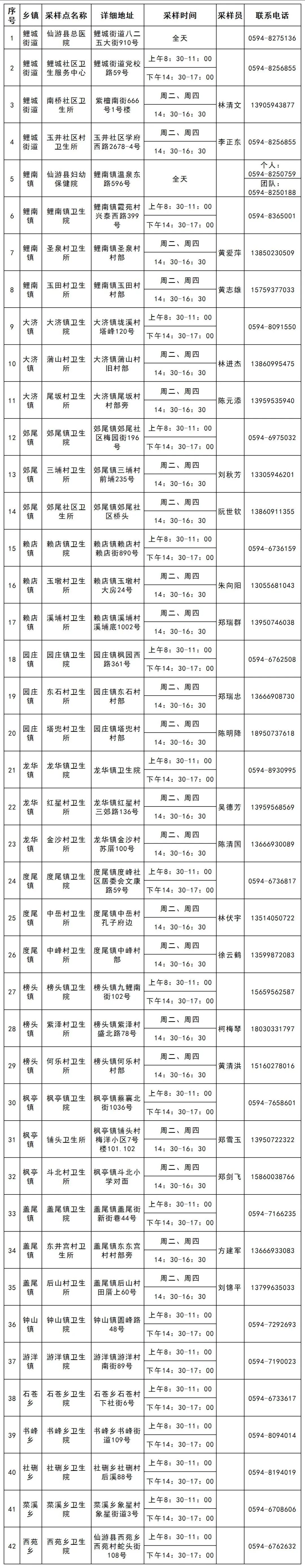 为贯彻落实国务院联防联控应对大规模奥密克戎疫情处置36条措施意见及5月31日卫教工作和疫情防控情况专题汇报会精神。做好高考期间疫情防控工作,切实发挥新冠病毒核酸检测在疫情防控中的监测预警作用,全面排查重点人群及一般人群感染风险,在城区增设11个便民核酸采样点:其中,鲤城街道南桥社区卫生所、玉井社区村卫生所和鲤南镇圣泉村卫生所、玉田村卫生所为6月3日-6日全天开放;鲤南镇仙游南门妇产专科医院、鲤城街道仙游城东医院、仙游县中医医院、蜚山卫生所、慈康中医医院 、仙游博爱医院、赖店镇仙游惠民中西医结合医院服务时间详见附件1。其余采样点时间不变,具体详见附件2。附件1:仙游县高考期间城乡便民核酸采样点一览表附件2:仙游县城乡便民核酸采样点一览表