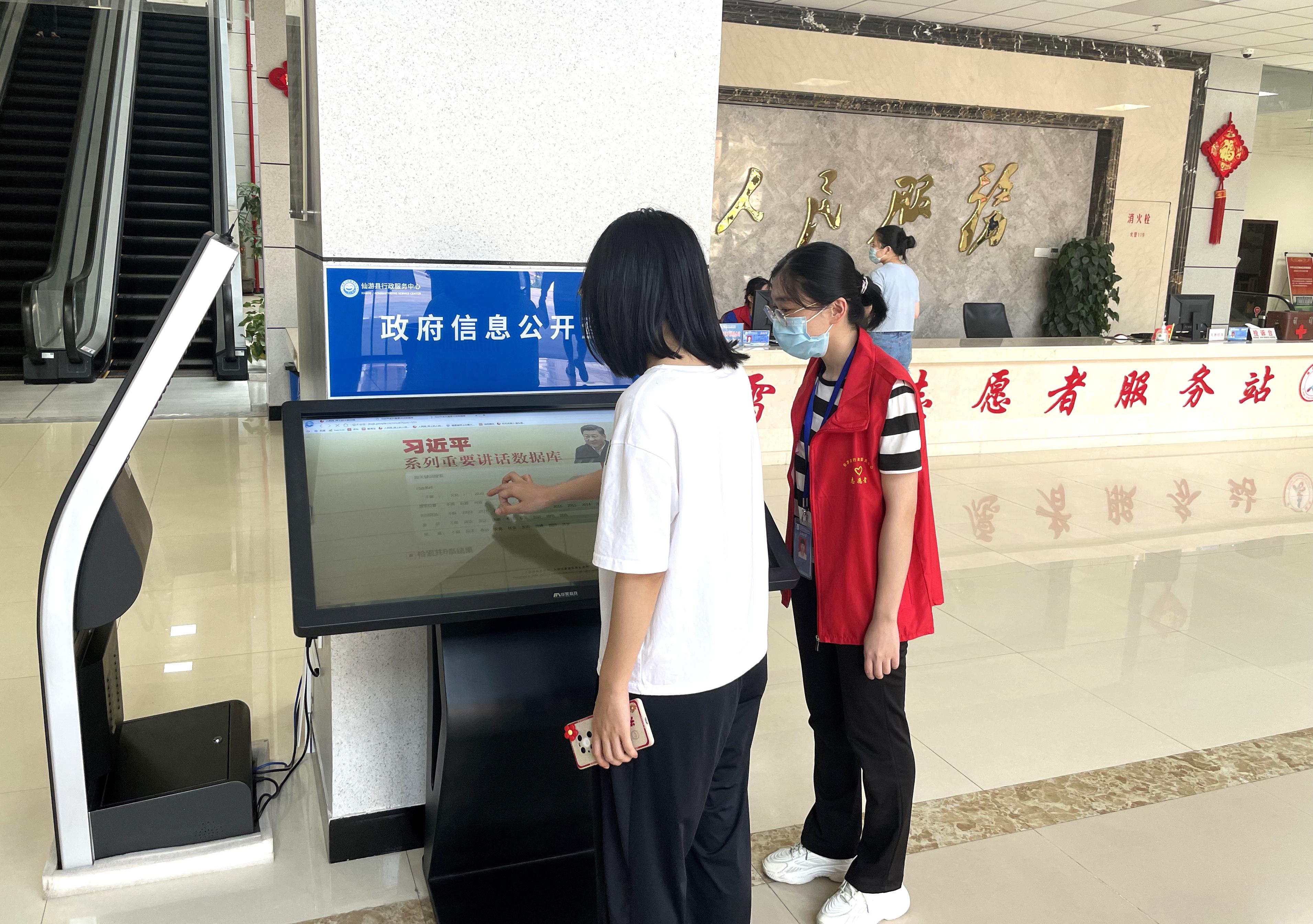 群众在仙游县行政服务中心政务公开专区查阅信息,志愿者提供咨询引导服务。
