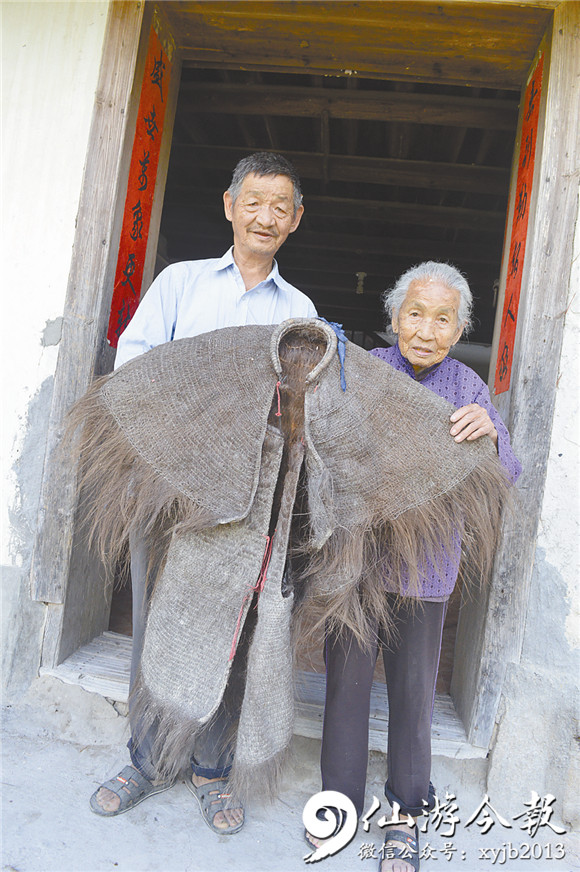 据邱金山介绍,1958年,一个闽南人挑来许多蓑衣来山上叫卖,当时以每副40元出售,吸引了许多村民购置。他家中97岁高龄的母亲、他自己及他的三个儿子都曾穿着它在田间劳作,风风雨雨58年,这件蓑衣算是他们家的功臣呢。