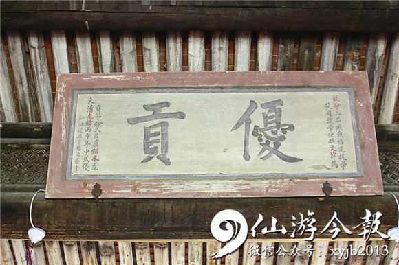 社硎卢氏祠堂所挂的这块“优贡”匾额是清光绪丙午年,光绪皇帝钦命当时的二品顶戴福建提学使司提学使姚文倬为那年贡第十二名,中二优的卢绍本所立。而这块匾额则是由当时的知仙游县事杨文荣所书。