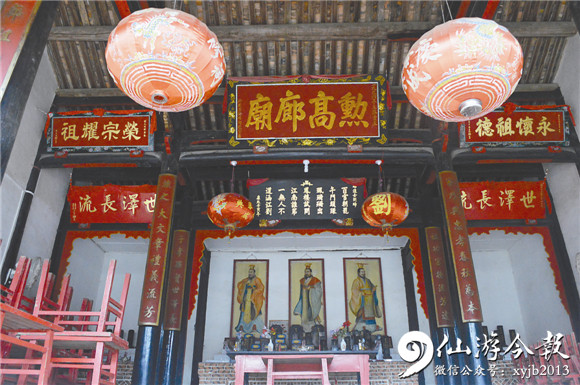 度尾镇霞溪村刘氏祠堂正厅供台中上方悬挂一匾额,上面刻写着:“百官朝罢午门头,环偑珊珊出凤楼。试问江南谁第一?无人不道涵江刘。”而在郊尾湖宅刘氏宗祠大门两侧,记者一行也看到了此诗。