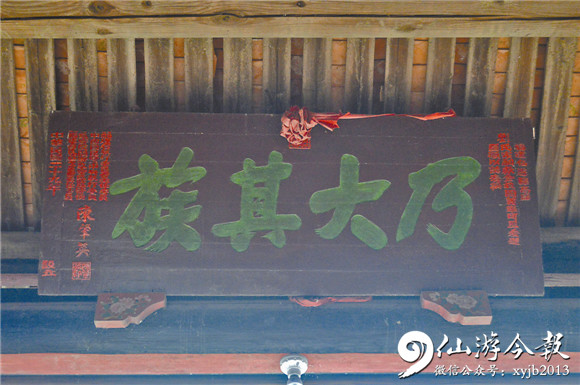 记者看到,这块牌匾为长方形木质雕刻,长约2米,宽约70多厘米。匾中刻着“乃大其族”四个苍劲有力的大字,右款书有“福建仙游县高廊刘氏宗祠献金救国义举可风,爰题赠匾额以誌表扬”字样。落款则为民国二十九年(1940年),时任国民党福建党部委员会主任委员、国民党中央执行委员、闽浙监察区监察使、闽浙救援会主任委员陈肇英。历经岁月淘洗,古匾愈发显得质朴无华,76年来一直悬挂在刘氏宗祠内。