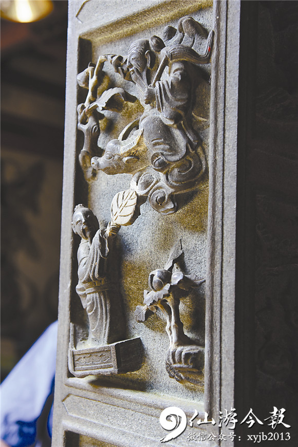 “庙对砺山观虎变,灵昭潮水庆龙兴”,据介绍,砺山村南潮宫原为宋代书院,明代改为宫庙,清乾隆九年(1744年)重建,嘉庆九年(1804年)重修。南潮宫被我县列为县级文物保护单位。郭怀自清乾隆九年(1744年)至嘉庆九年(1804年)历时60年精雕而成的龙柱,被称为花岗石雕杰作。此外,道光五年(1825年)开建的古代石雕艺术精品东门石坊,度尾镇剑山村杨泗宫宫内的石刻浮雕均出自郭怀师徒之手。