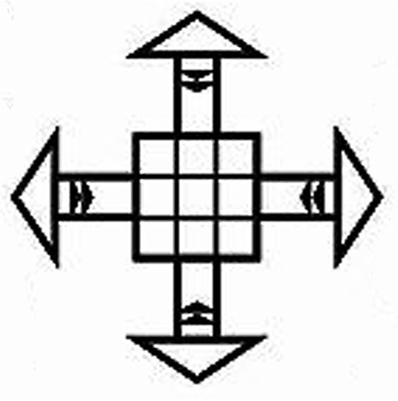大正方形四方分别有一个三角形和长方形组成的箭头,表示城郭的四方都建有房屋,三角形代表房子的屋顶,长方形代表屋子。长方形里面有两个小实心三角形,代表人字,表示里面有人居住,而且成双成对,代表有男有女,阴阳相济。总体表示城郭里外四方生活着人民。人民依城而居,以郭为姓。