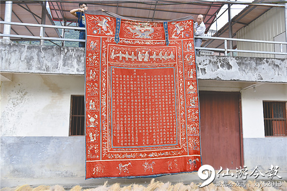 据了解,寿帐旧称“生锦”,是明清时期送给做寿之人的锦帛类礼品,多为官绅互赠或馈送得功名者。清朝寿帐在我县不多见,如此精美的巨幅“寿帐”被保存下来,每逢婚嫁、祝寿、元宵等佳节,桃源流郭氏族人都会将这幅图帐挂起,以示隆重。