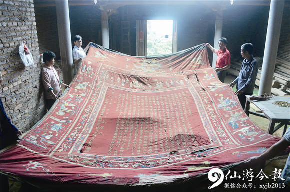 近日,在龙华镇金沙村新交林自然村,记者看到村民赖啟照收藏的拥有100多年历史的图帐。当众人一起摊开这图帐后,展现在记者眼前的是一幅长约4.8米、宽3.2米的巨大刺绣图帐(如图)。这图帐缝合了两层麻布,背面主要是藏青色,正面的红色布料上是用金丝绣成的序文,字的左、右、上三侧是一幅幅神态各异的祝寿图。序文“恭祝/大间范赖母杨太孺人六十荣寿序……盖闻乾刚自成坤顺日曜应配月光人之立德立言垂声施于不朽……嵩翁可谓有克家肖子而孺人者诚女中之丈夫其为寿与赖氏世世长存以垂诸不朽岂不懿哉是为序/旹在……咸丰十年岁次庚申王春毂旦/议叙国子监典籍候选县郎姻愚弟林舜云顿首拜撰”。