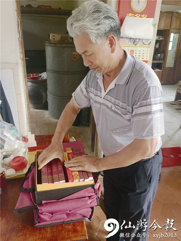 在龙华镇金沙村埔林自然村,现年65岁的赖世明向记者介绍眼前一箱新编修的族谱。“这箱内有完整的7卷族谱和2卷房谱,是前些年大家花了很大精力才修订好的,很珍贵。”赖世明爱不释手地说道。