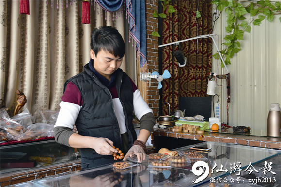 廖雄枫的店位于榜头南溪街上,在整条街满满当当的工艺品店铺中,他的店铺并不显眼。廖雄枫主要经营崖柏工艺品,从前两年开始,便涉足电商领域,从早期的微商、淘宝等渠道,一直到现在的微拍平台。