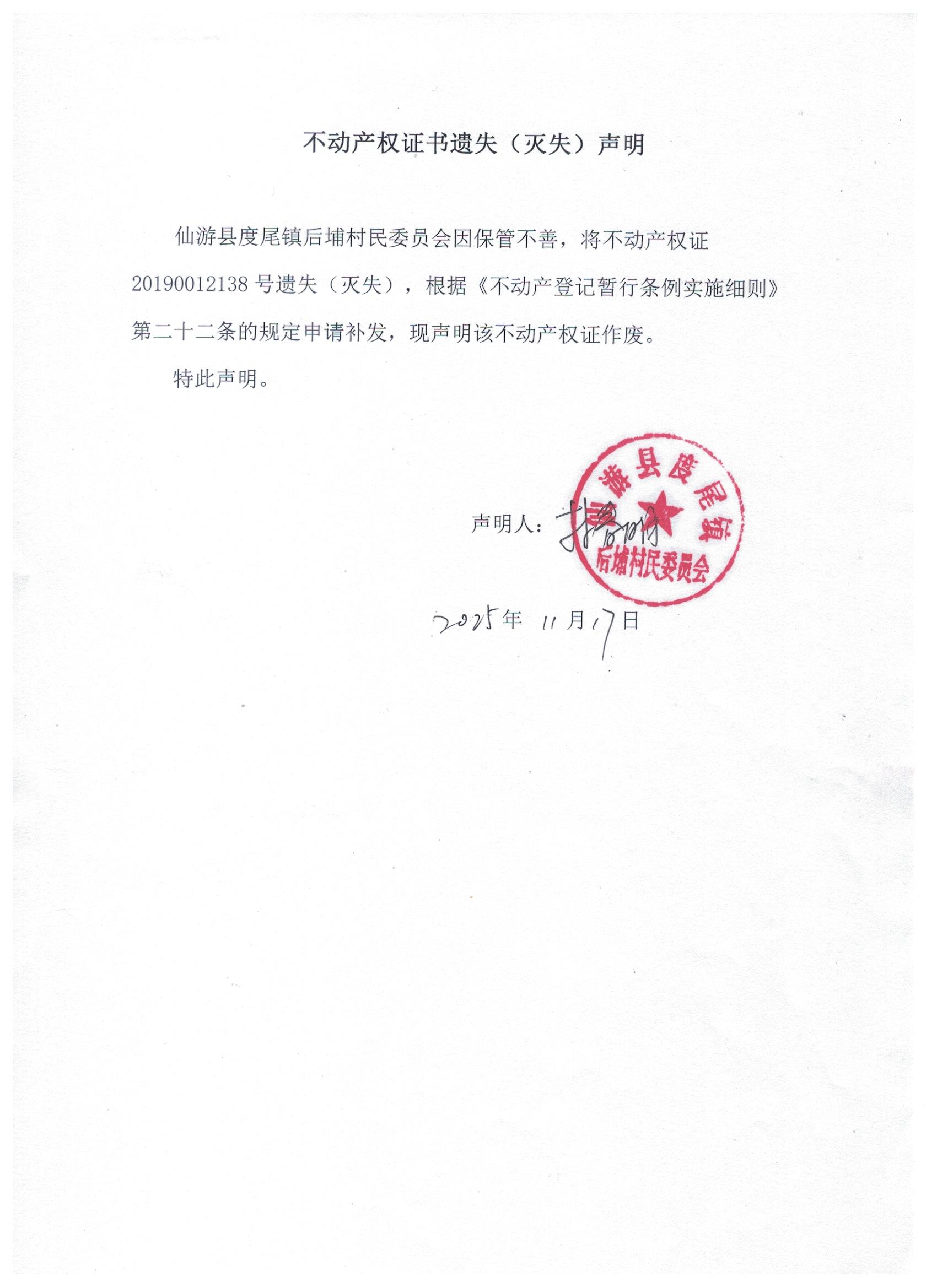关于仙游县度尾镇后埔村民委员会不动产权证20190012138号遗失声明作废的公告