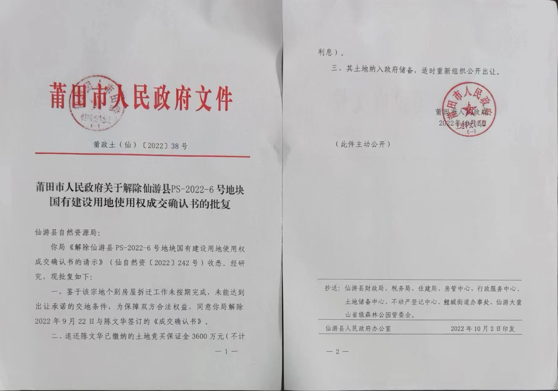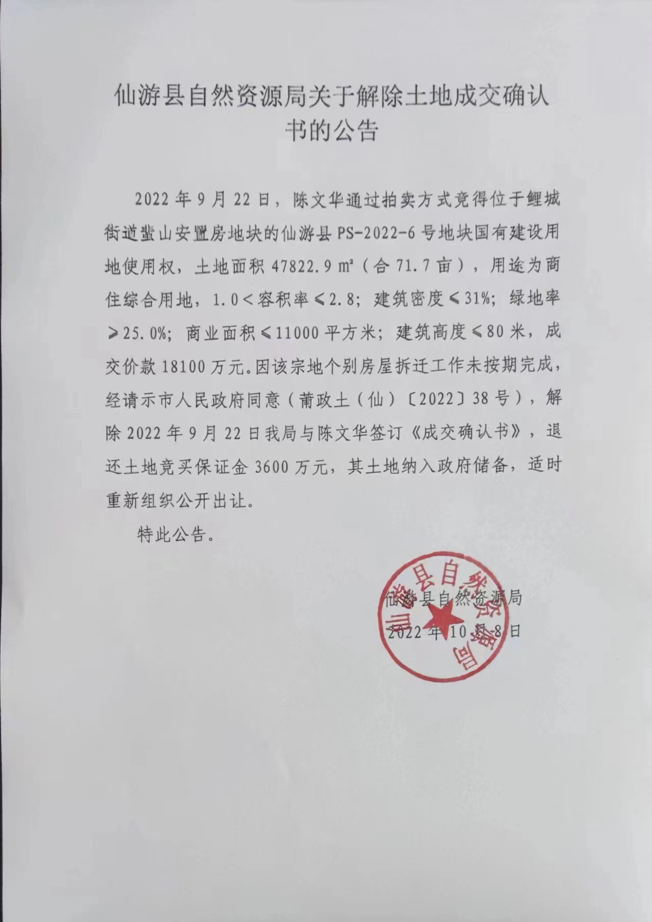 仙游县自然资源局关于解除PS-2022-6号地块成交确认书的公告
