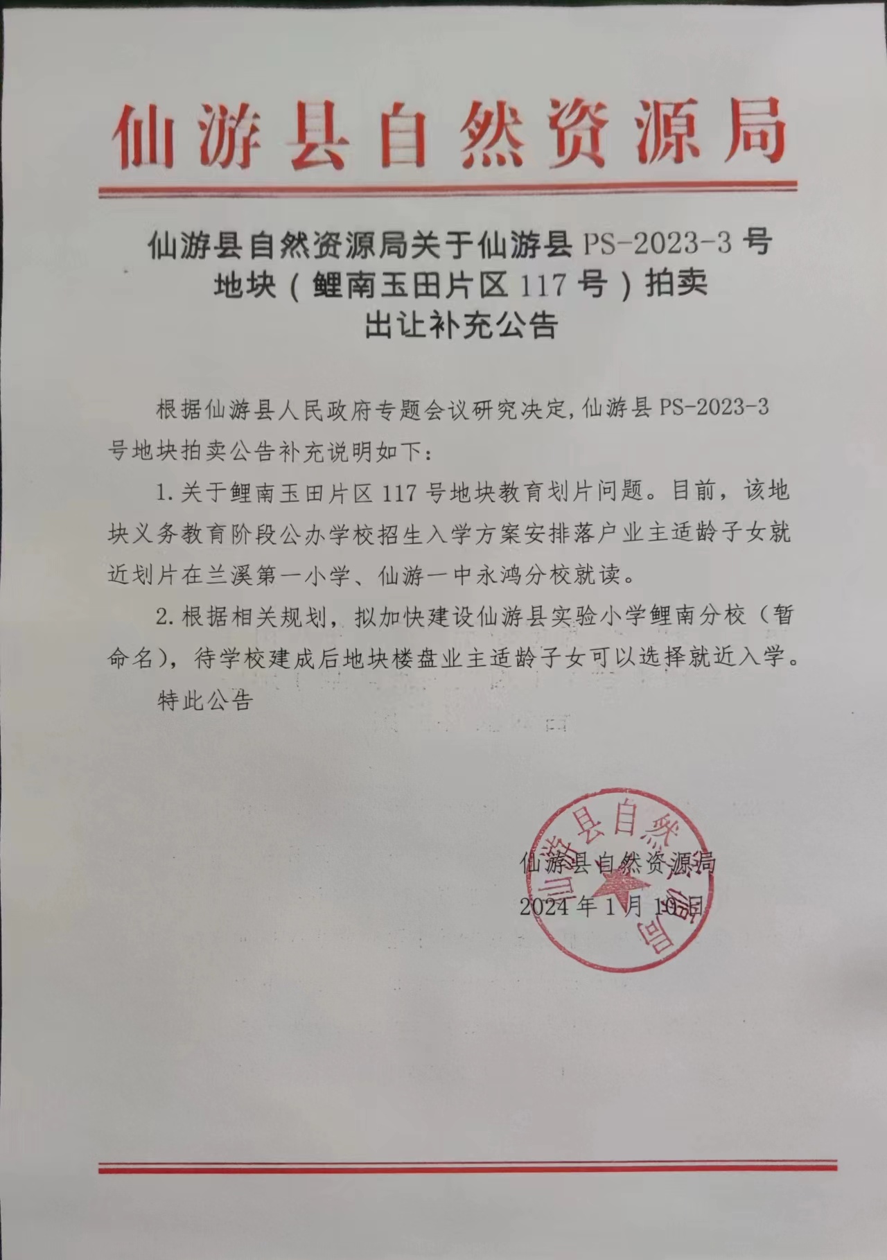 仙游县自然资源局关于仙游县PS-2023-3号地块(鲤南玉田片区 117 号 )拍卖出让补充公告