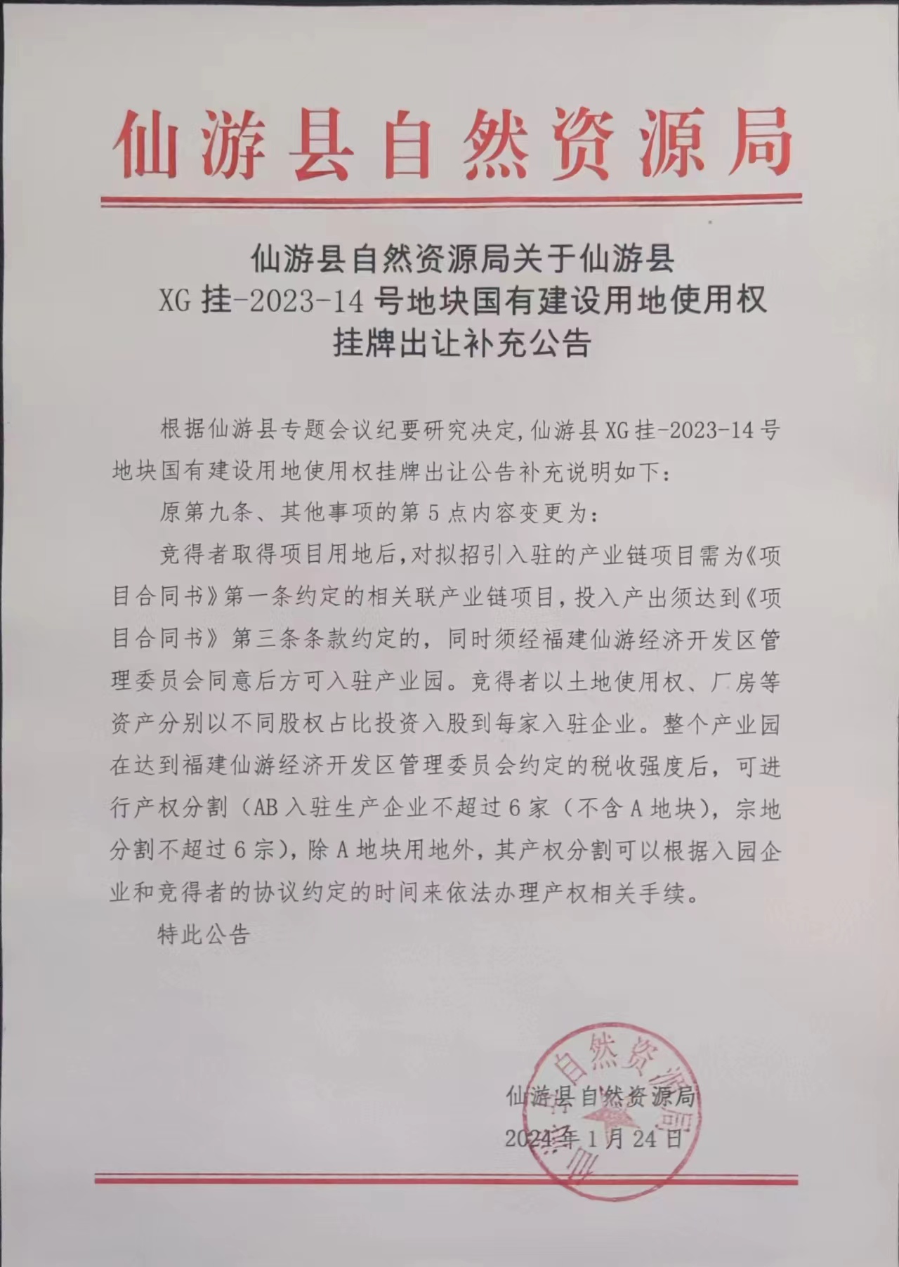 仙游县自然资源局关于仙游县XG 挂-2023-14号地块国有建设用地使用权挂牌出让补充公告