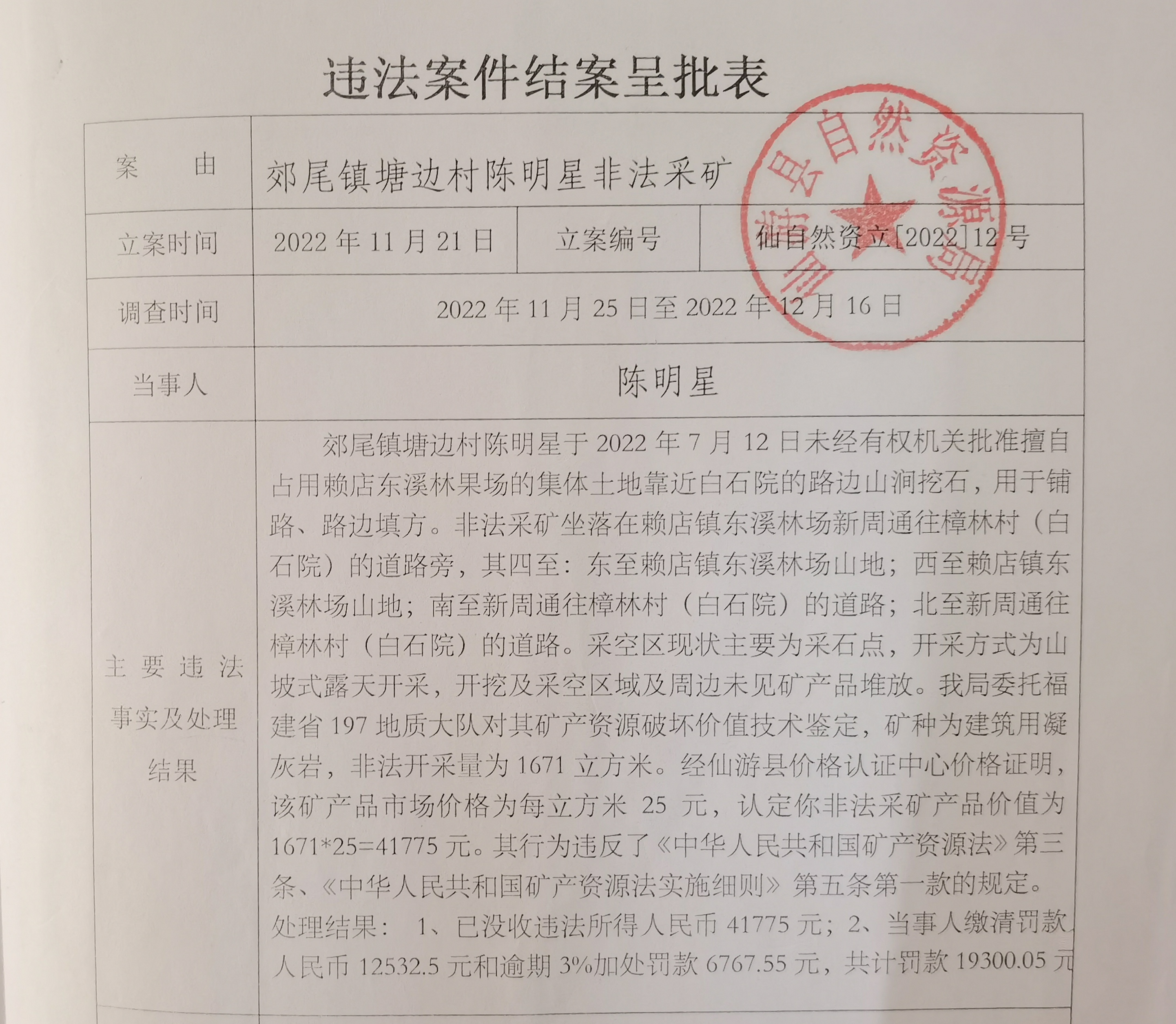 根据《中华人民共和国矿产资源法》第三十九条、《中华人民共和国矿产资源法实施细则》第四十二条第一项以及《福建省国土资源行政处罚裁量权执行标准》第19项的规定,本机关拟作出如下行政处理意: