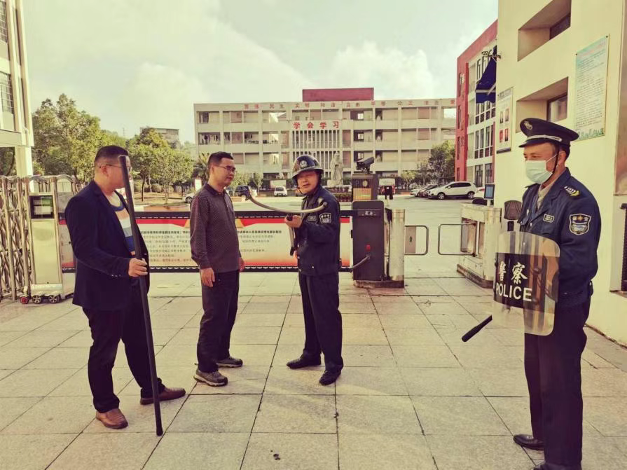 传授“应急小单元”战术,指导使用防暴器械,模拟“歹徒持械闯入”场景下的快速封控。