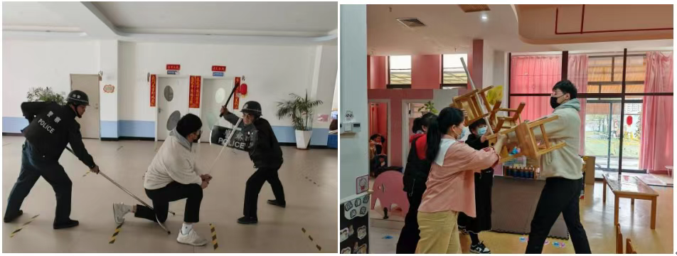 “有可疑人员持械闯入校门!”蜚山幼儿园门口警报骤响。保安立即启动“应急小单元”机制,一人持盾牌正面拦截,一人用钢叉控制“歹徒”下肢,教师快速引导学生撤回教室锁闭门窗。