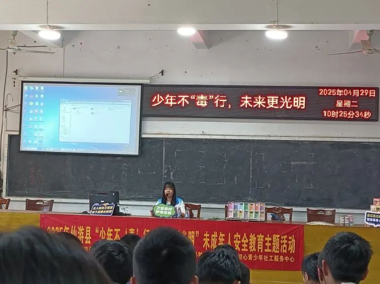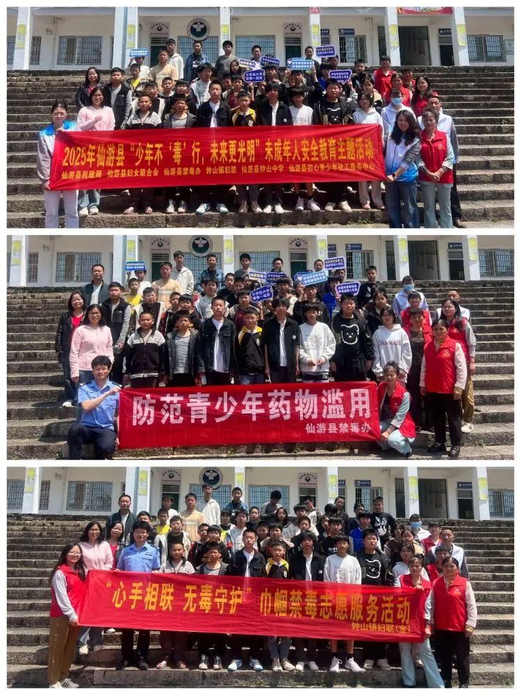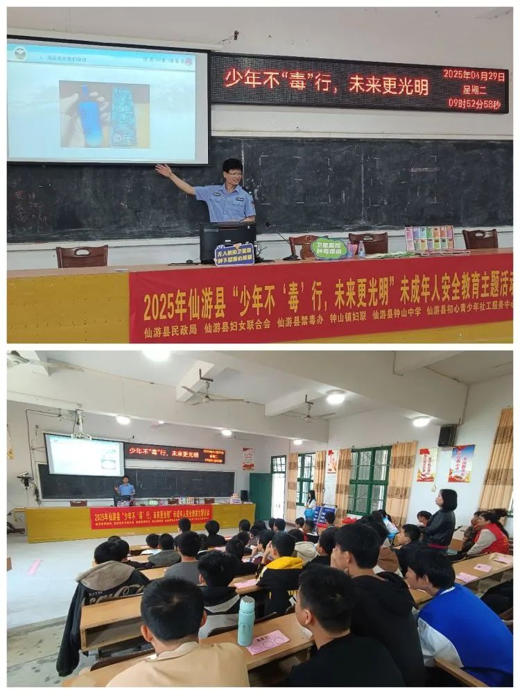 2025 年4月29日上午,由仙游县民政局、仙游县禁毒办、钟山镇妇联和钟山中学联合举办的“少年不‘毒’行,未来更光明”未成年人安全教育主题活动在钟山中学顺利开展。此次活动旨在加强未成年人的安全教育,提高他们对毒品危害的认识,增强自我保护意识,培养健康的生活方式和积极向上的价值观,七、八年段的学生共同参与了此次活动。