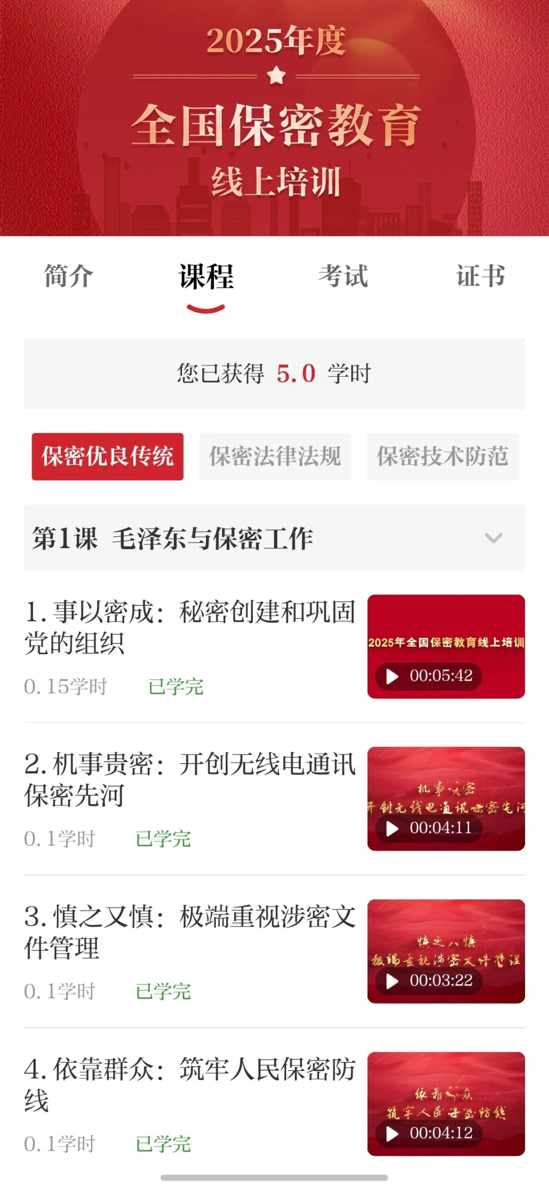 进入系统,点击“课程”开始学习。课程内容包含保密优良传统、保密法律法规、保密技术防范和保密警示案例4部分,以视频、音频为主。可在学习页面随时查看已获得的学时。