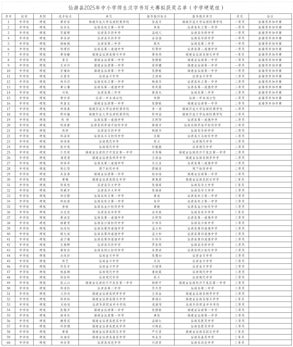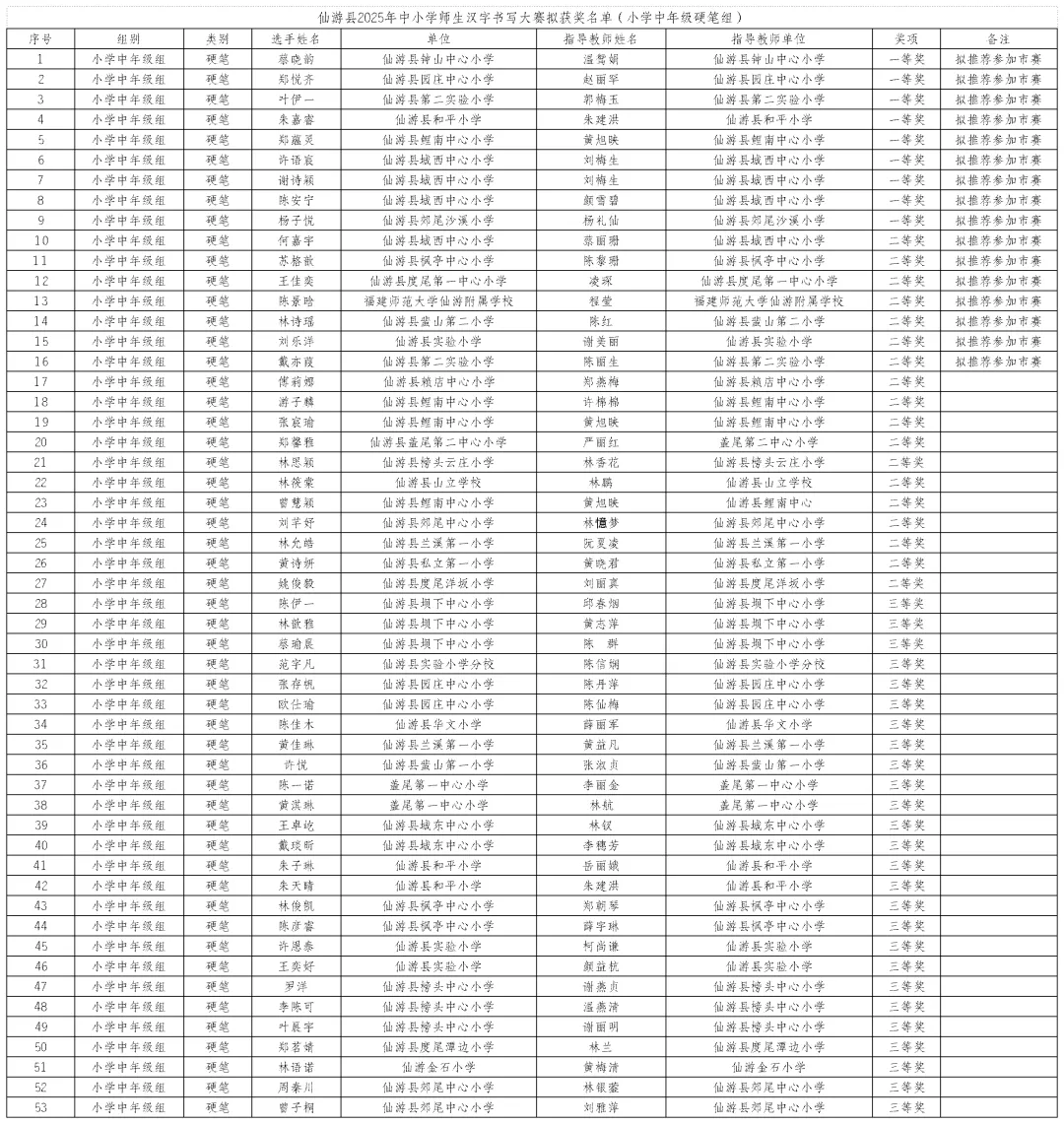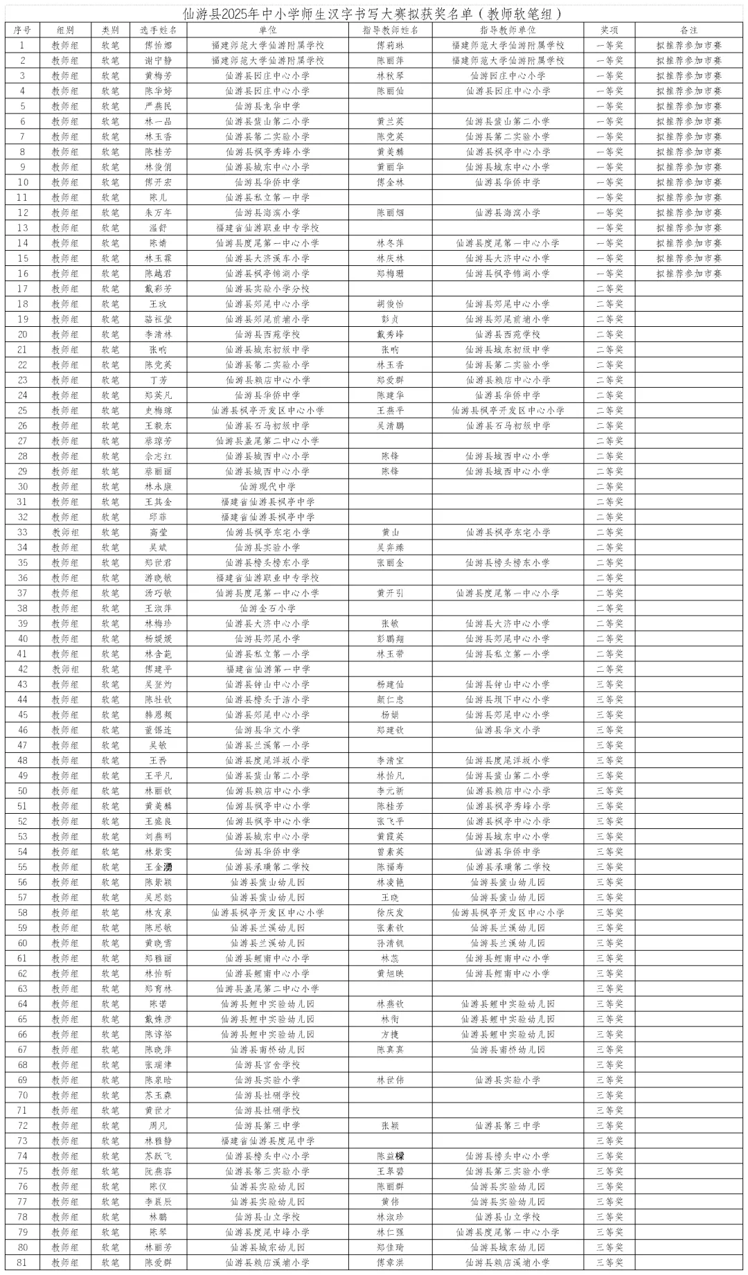 现将仙游县2025年中小学师生汉字书写大赛获奖结果公示如下。