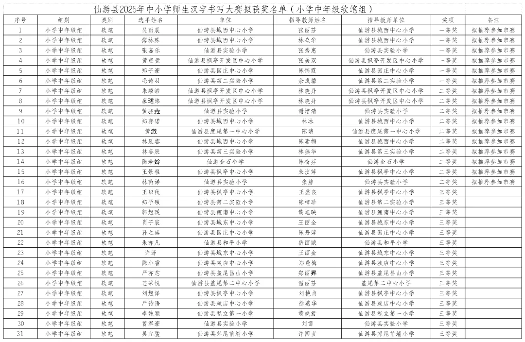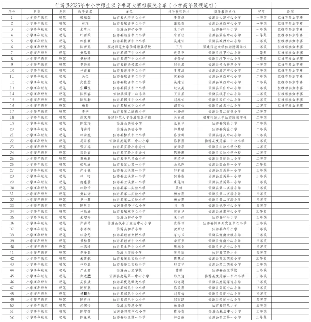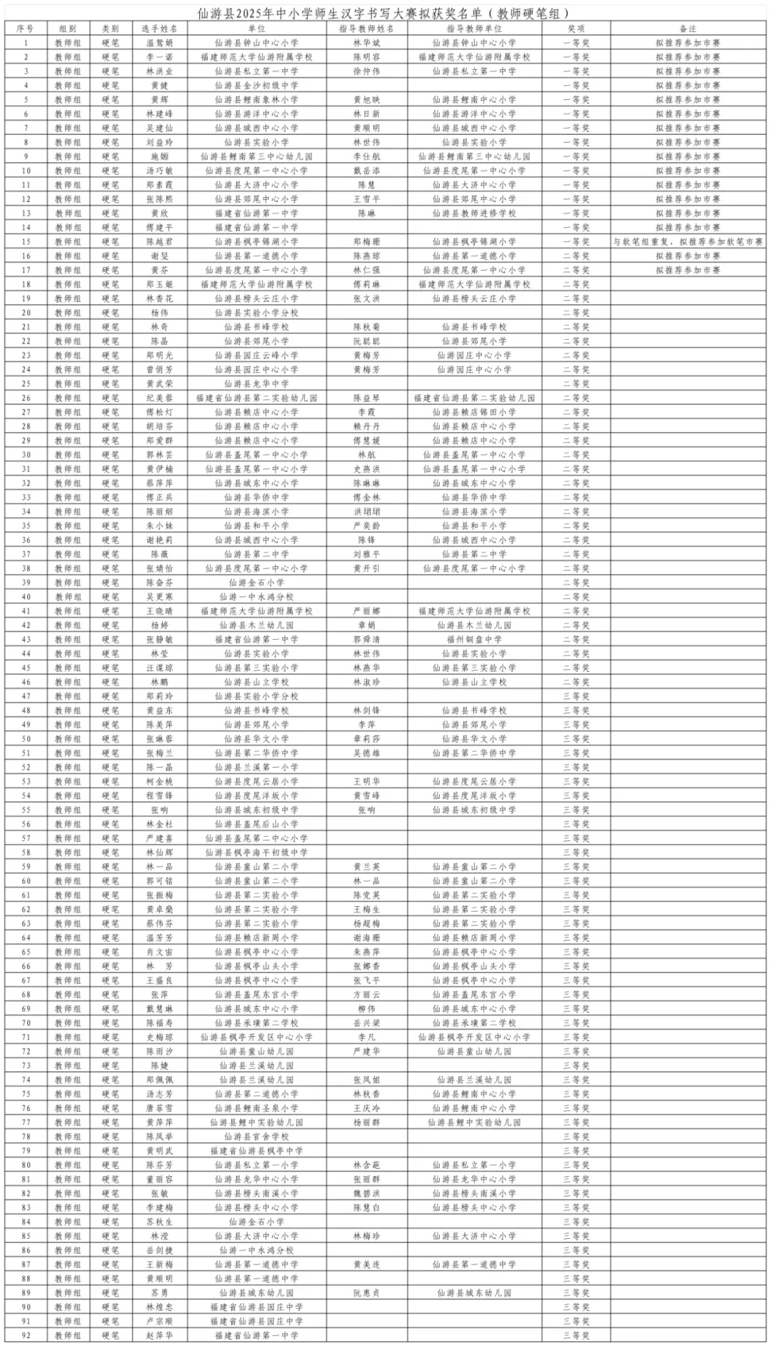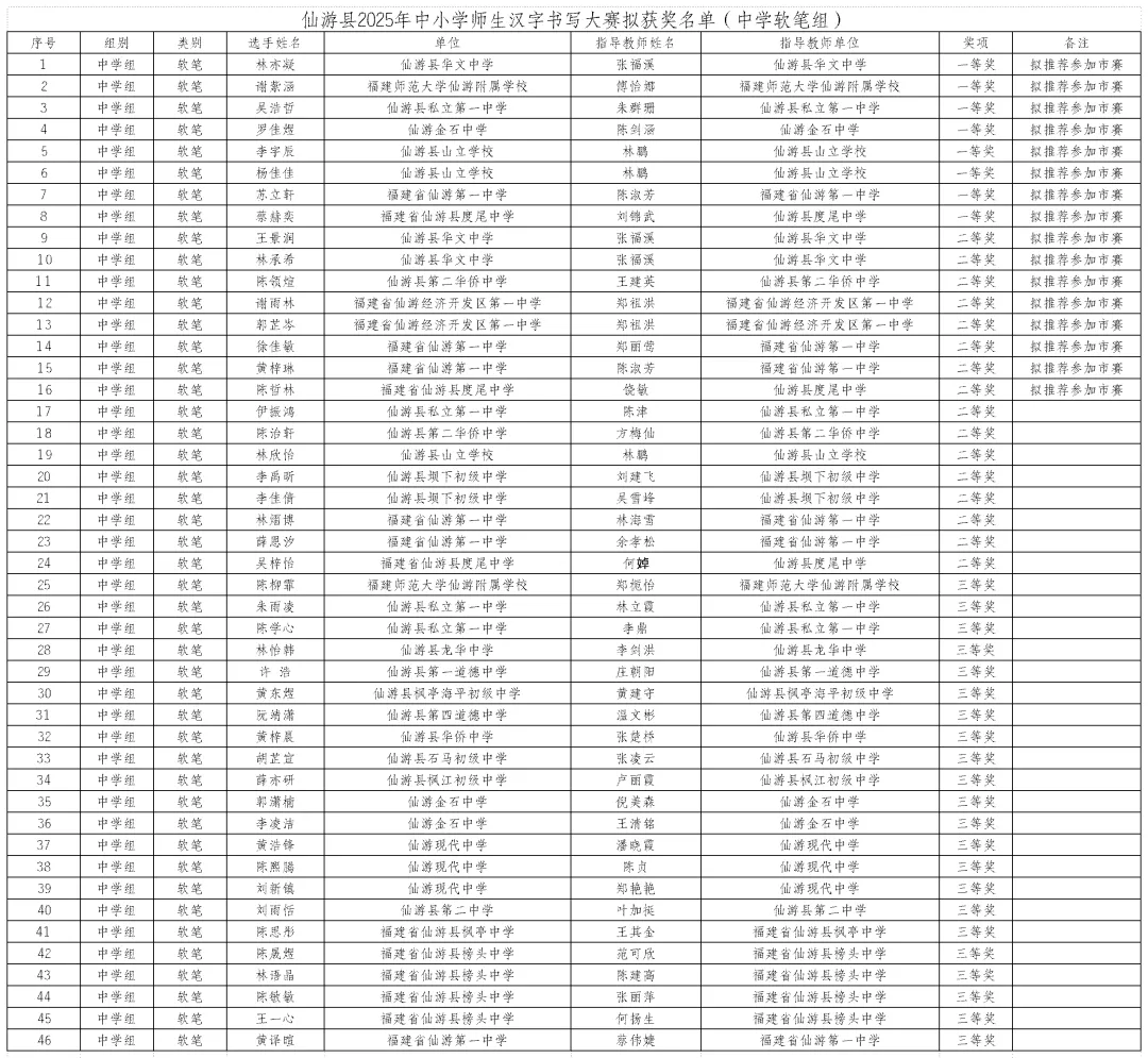 现将仙游县2025年中小学师生汉字书写大赛获奖结果公示如下。