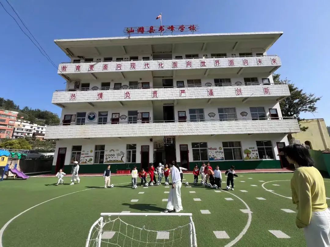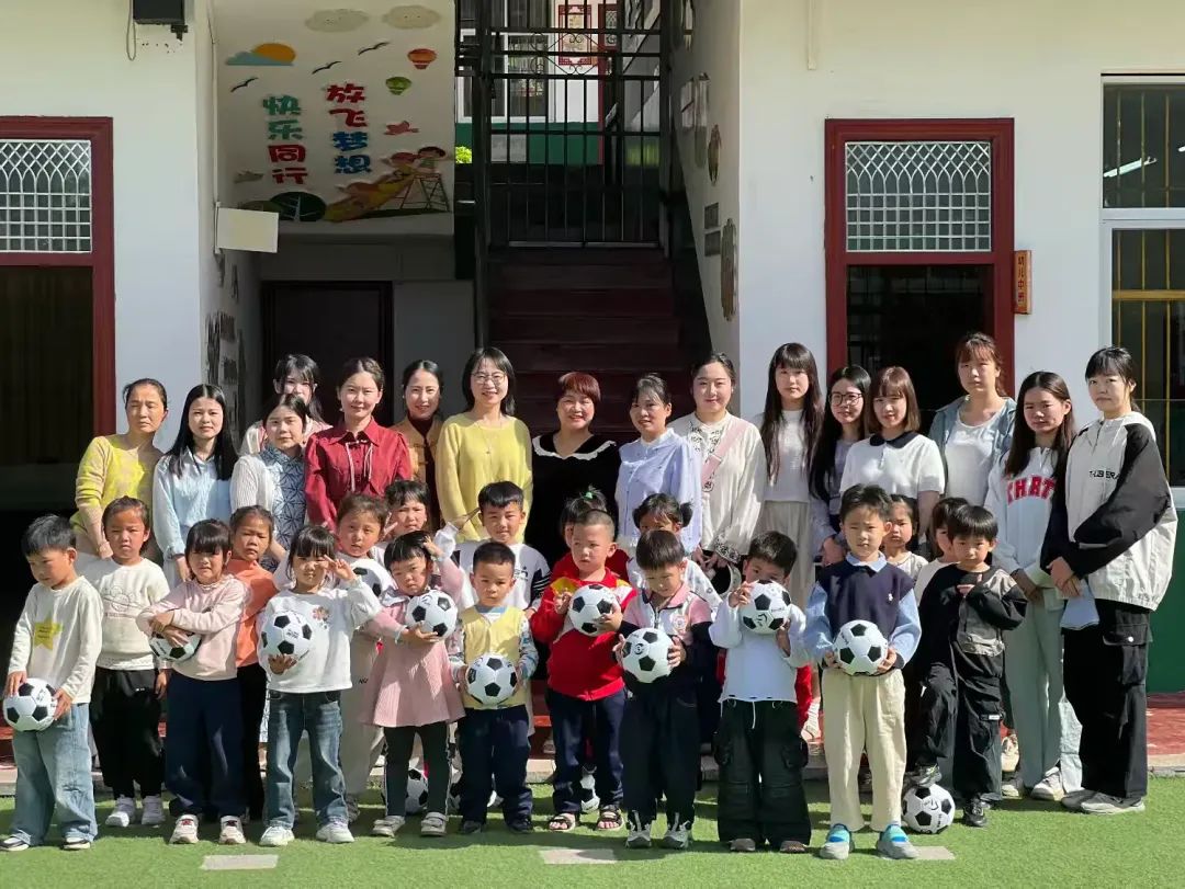清晨的书峰学校操场热闹非凡,蜚山幼儿园的孩子们化身"足球小使者",向山区小伙伴赠送了20个定制足球。两园儿童在教师引导下,以混龄游戏的形式开展"趣味运球接力""足球保龄球"等创意活动。