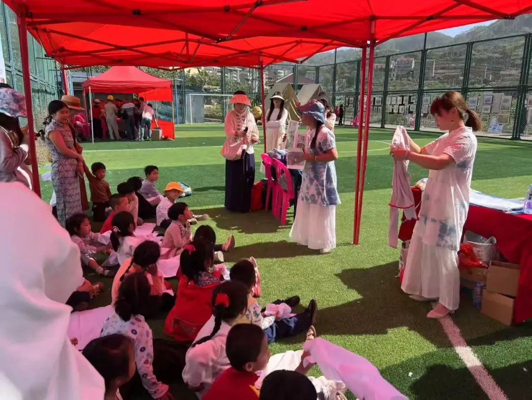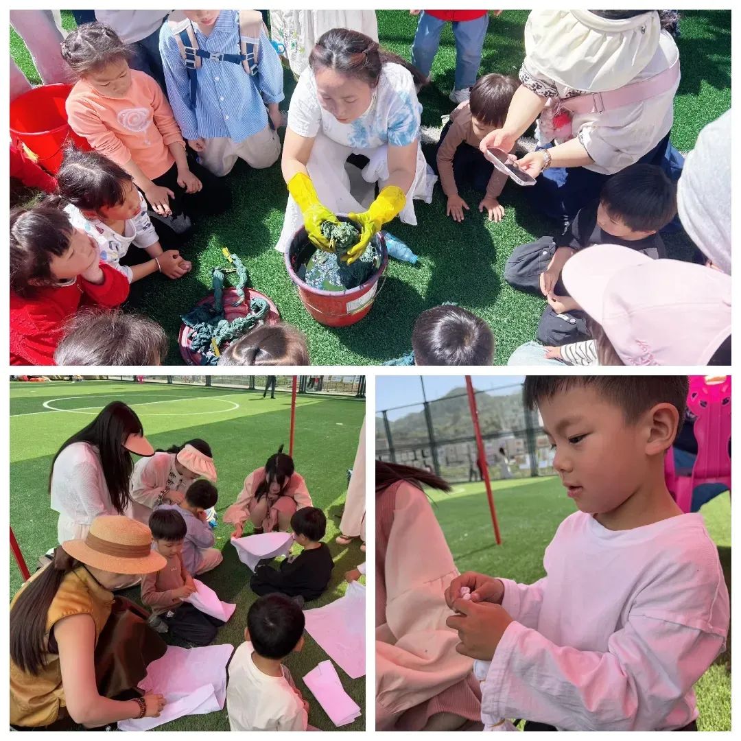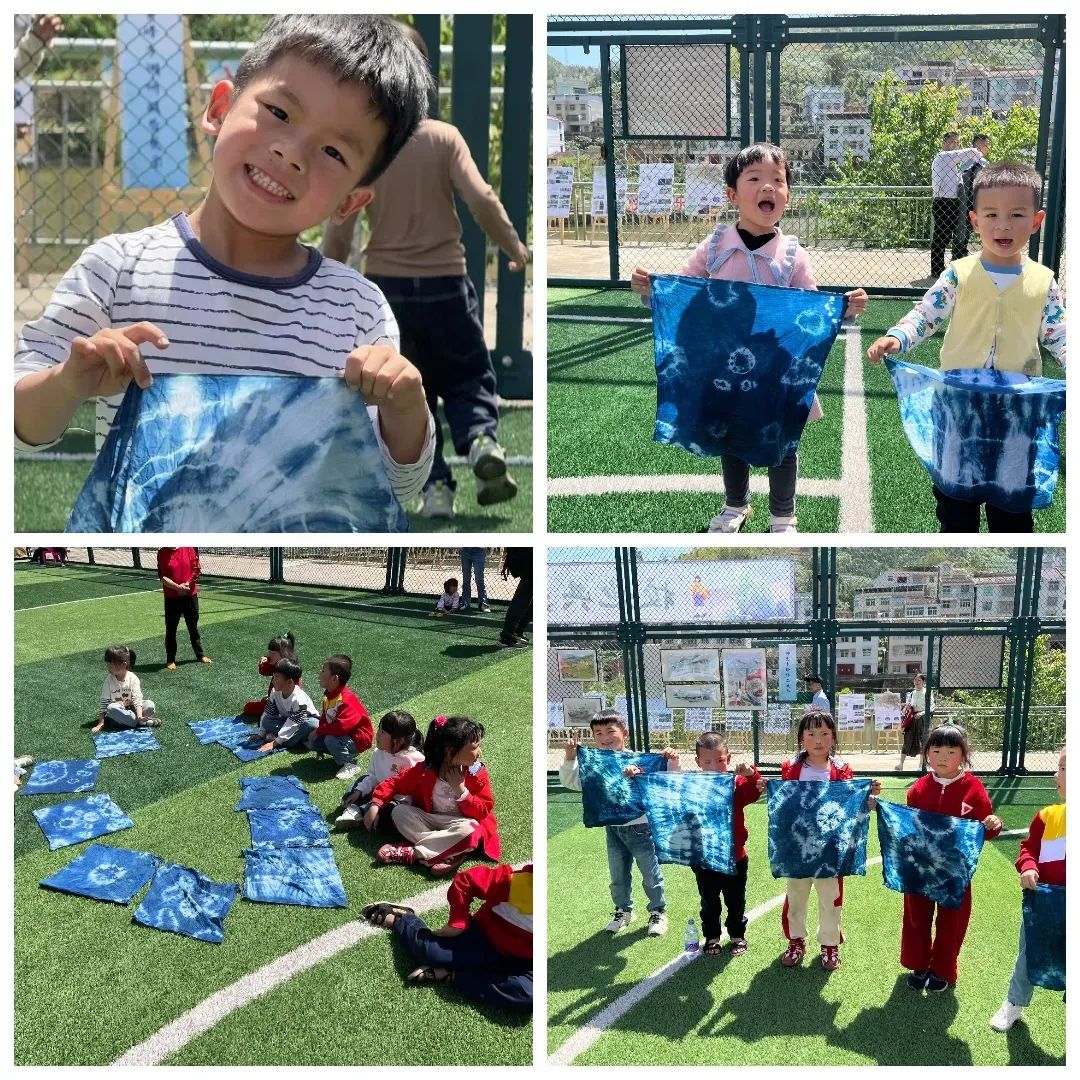在书峰扎染工坊,孩子们跟随非遗传承人学习扎染技艺。折叠、捆扎、浸染……当一方方白布在青黛汁液中绽放出蓝白相间的花纹时,幼儿们发出阵阵惊叹。更令他们惊喜的是,这些蓝色染料竟来自田间种植的青黛草。
