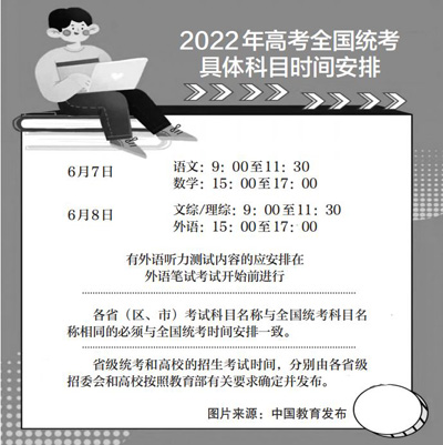 近日,教育部印发《关于做好2022年普通高校招生工作的通知》,对2022年普通高校招生工作作出部署。据了解,今年高考全国统考将于6月7日、8日举行,具体科目考试时间安排为:6月7日9:00至11:30语文,15:00至17:00数学;6月8日9:00至11:30文科综合/理科综合,15:00至17:00外语,有外语听力测试内容的应安排在外语笔试考试开始前进行。各省(区、市)考试科目名称与全国统考科目名称相同的必须与全国统考时间安排一致。