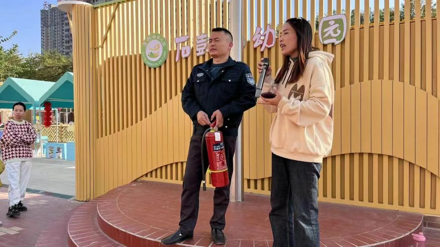 现场演示灭火器“提、拔、握、压”四步操作法。
