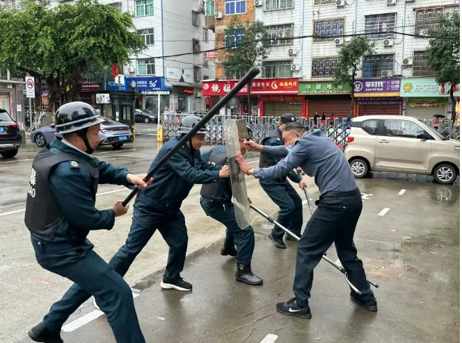 传授“应急小单元”战术,指导使用防暴器械,模拟“歹徒持械闯入”场景下的快速封控。