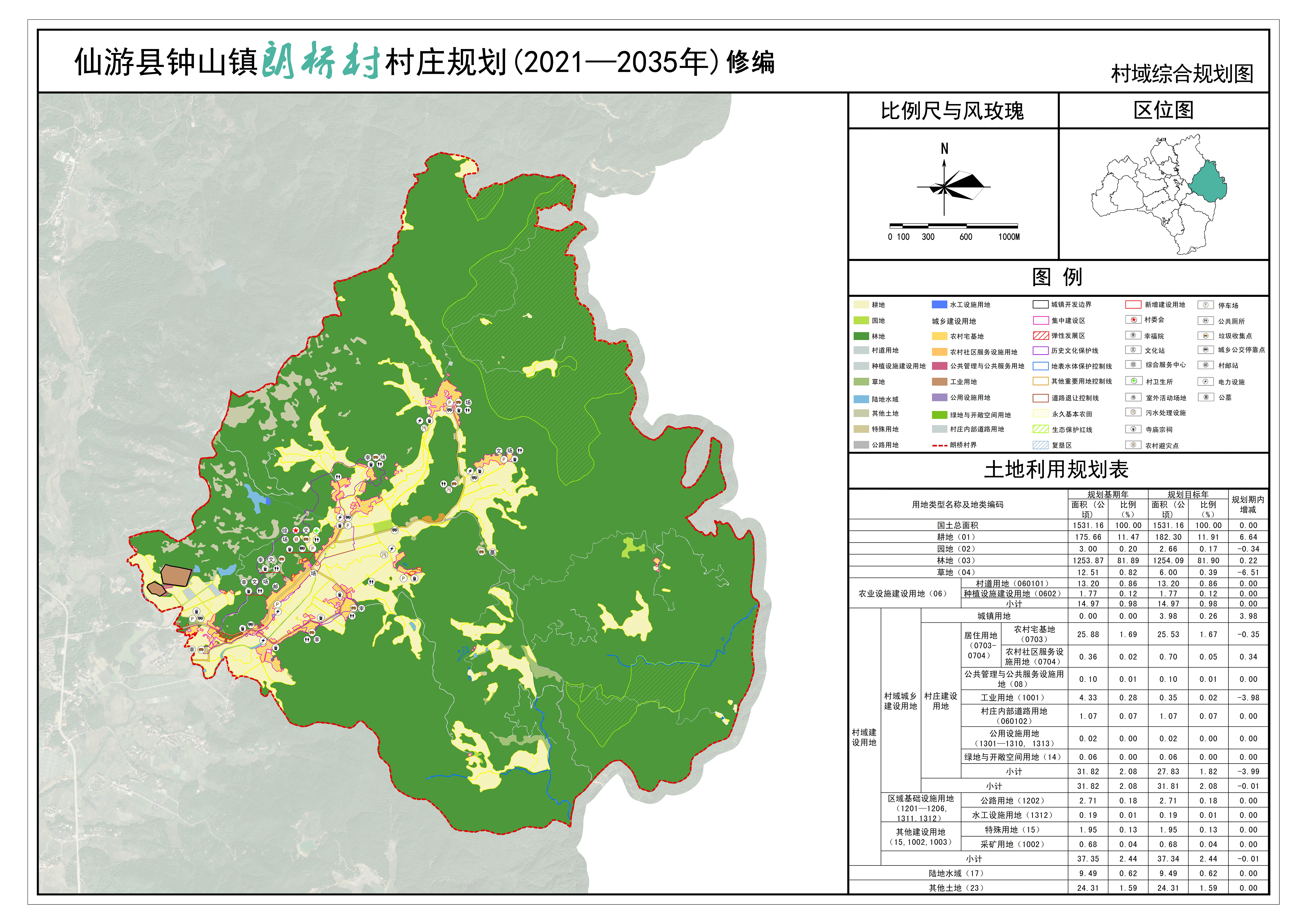 本次规划范围为朗桥村行政区划范围,涵盖括塔兜、朗桥、宝峰、上董、上美、好垅、新厝、林头、高明、后岭、东坑、云峰、林刘、内洋、高峰、苍代、社垅、九天宫、三溪和水坑20个村庄居民点,总面积为1531.16公顷。