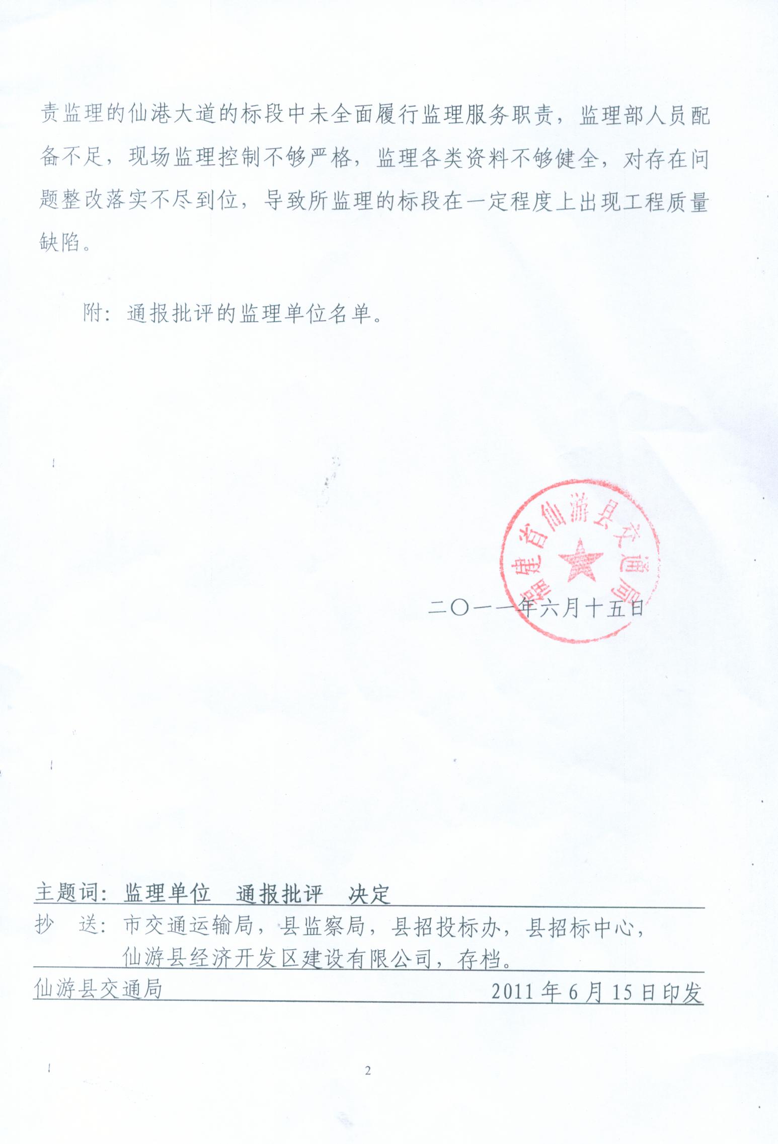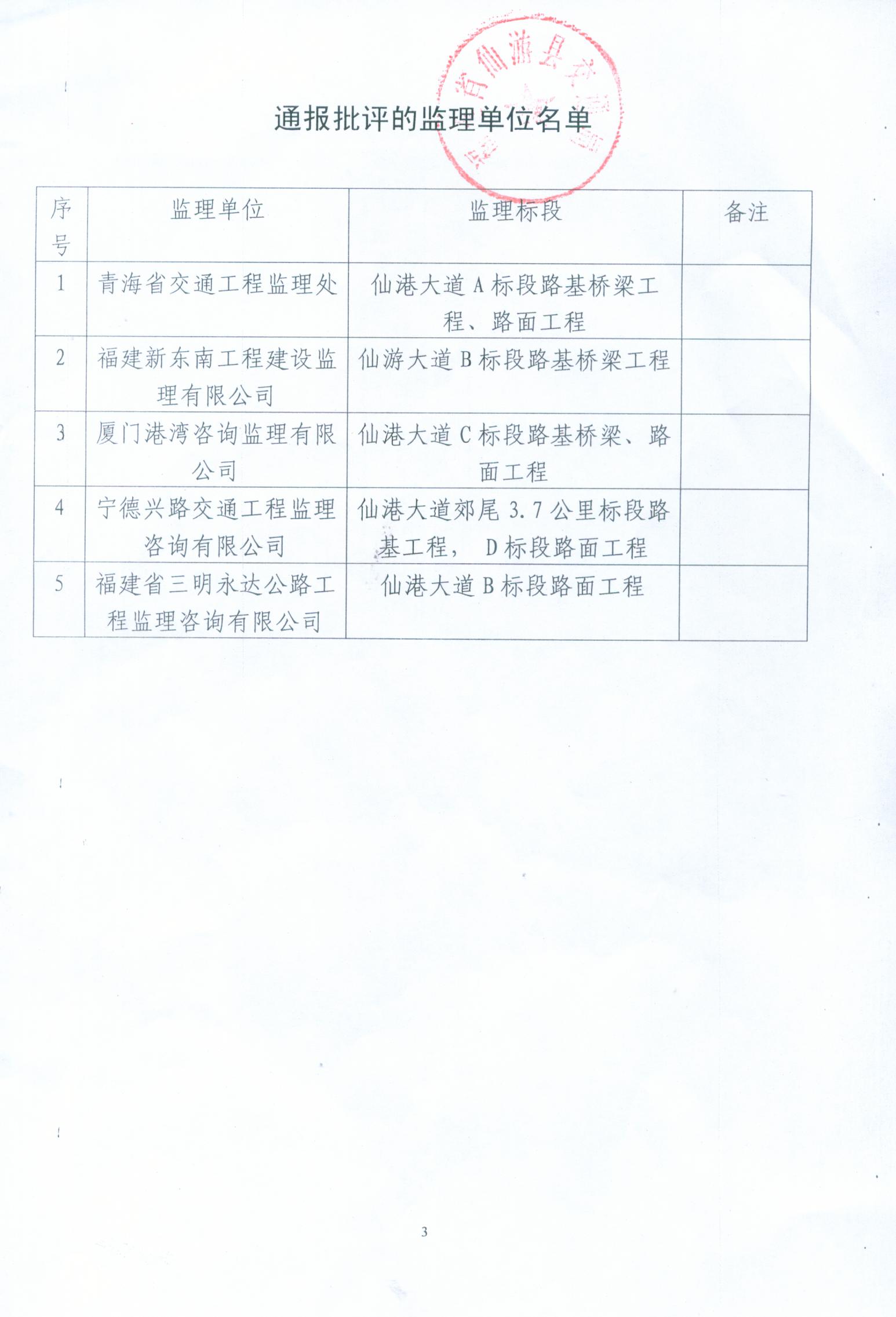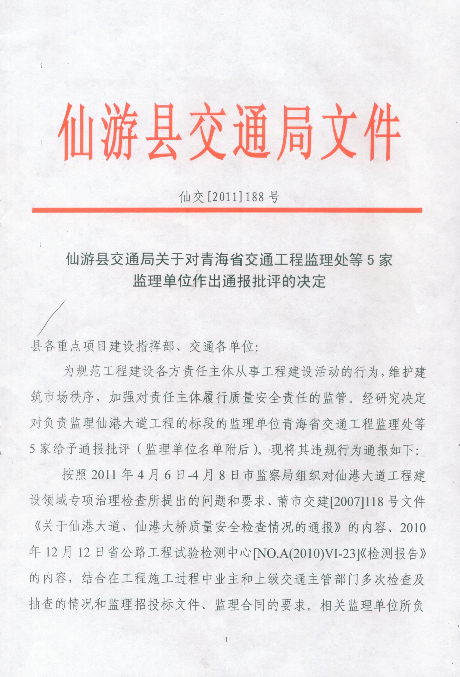 仙游县交通局关于对青海省交通工程监理处等5家监理单位作出通报批评的决定