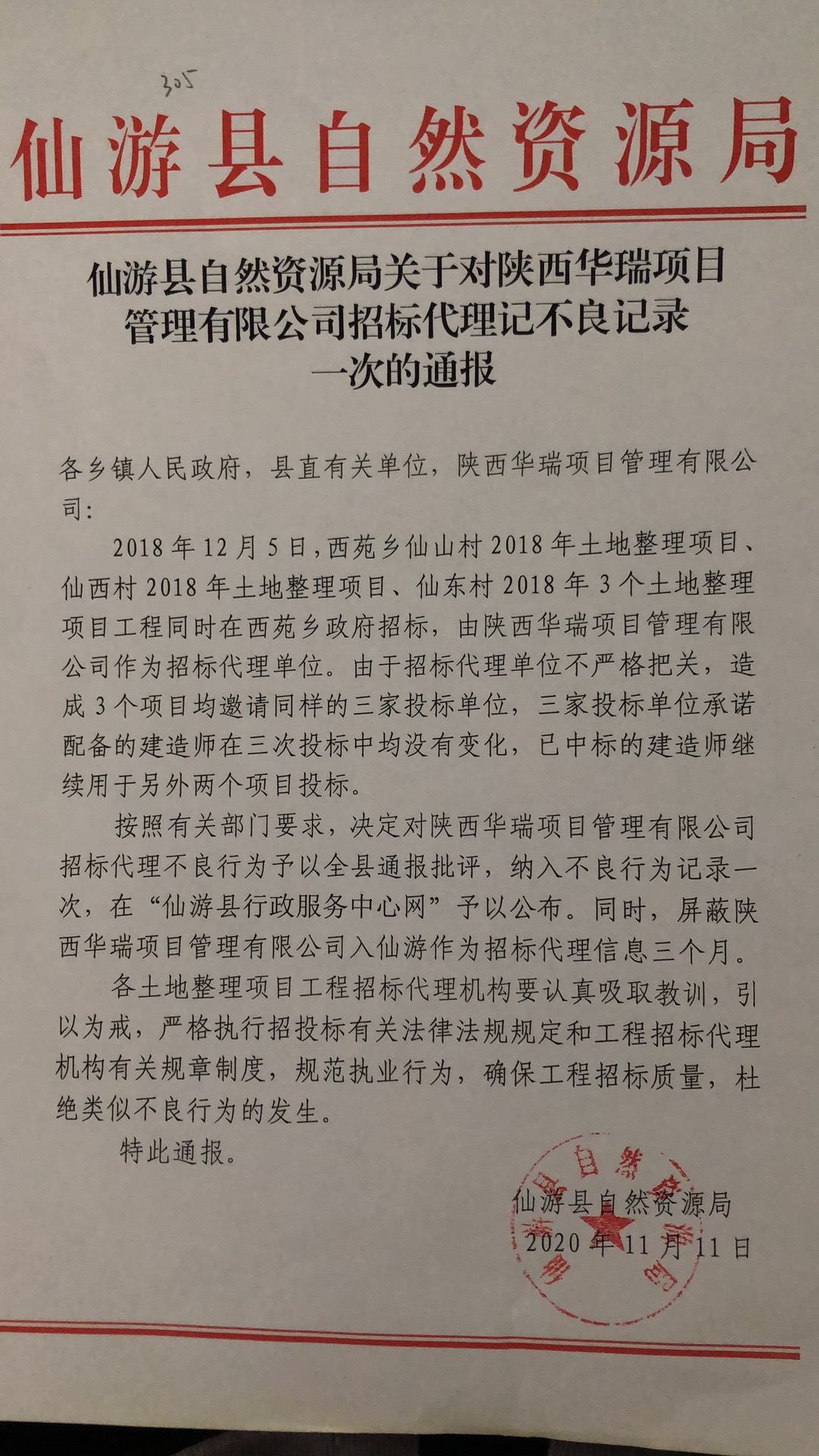 仙游县自然资源局关于对陕西华瑞项目管理有限公司招标代理记不良记录一次的通报