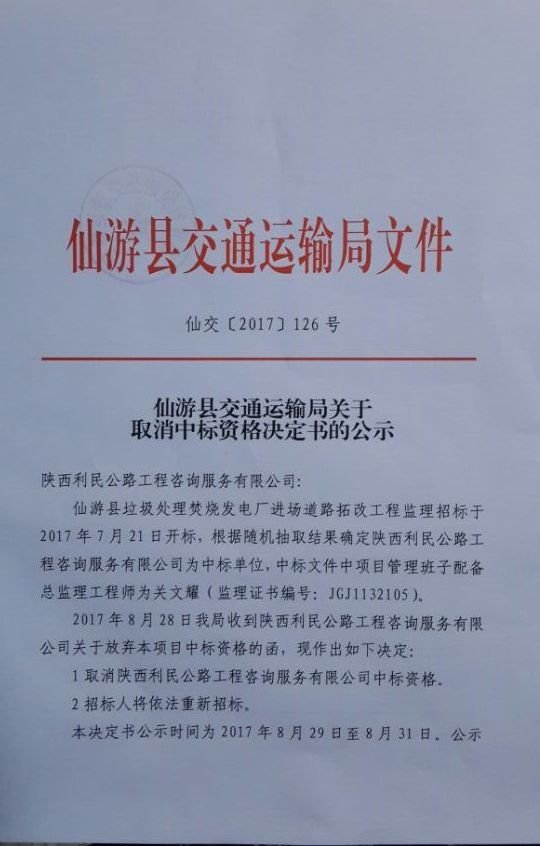 关于取消陕西利民公路工程咨询服务有限公司中标资格决定书的公示