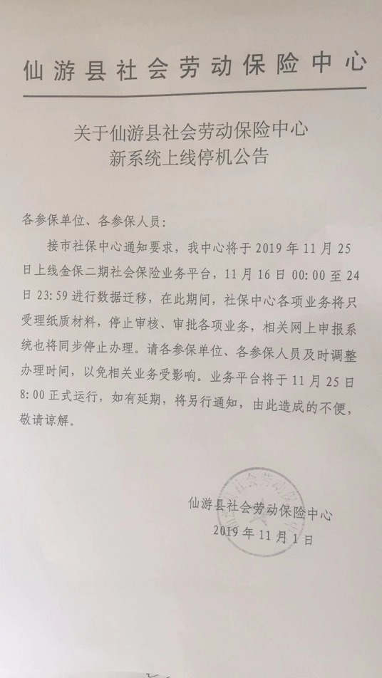 关于仙游县社会劳动保险中心新系统上线停机公告
