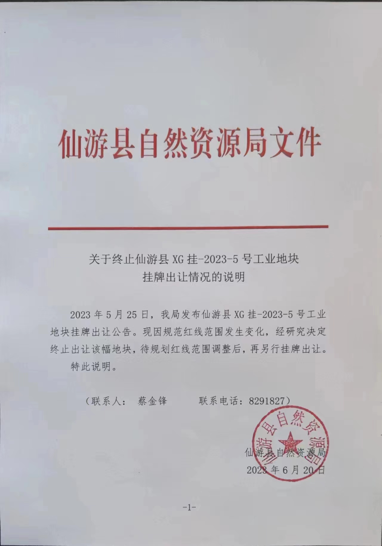 关于终止仙游县XG 挂-2023-5 号工业地块挂牌出让情况的说明