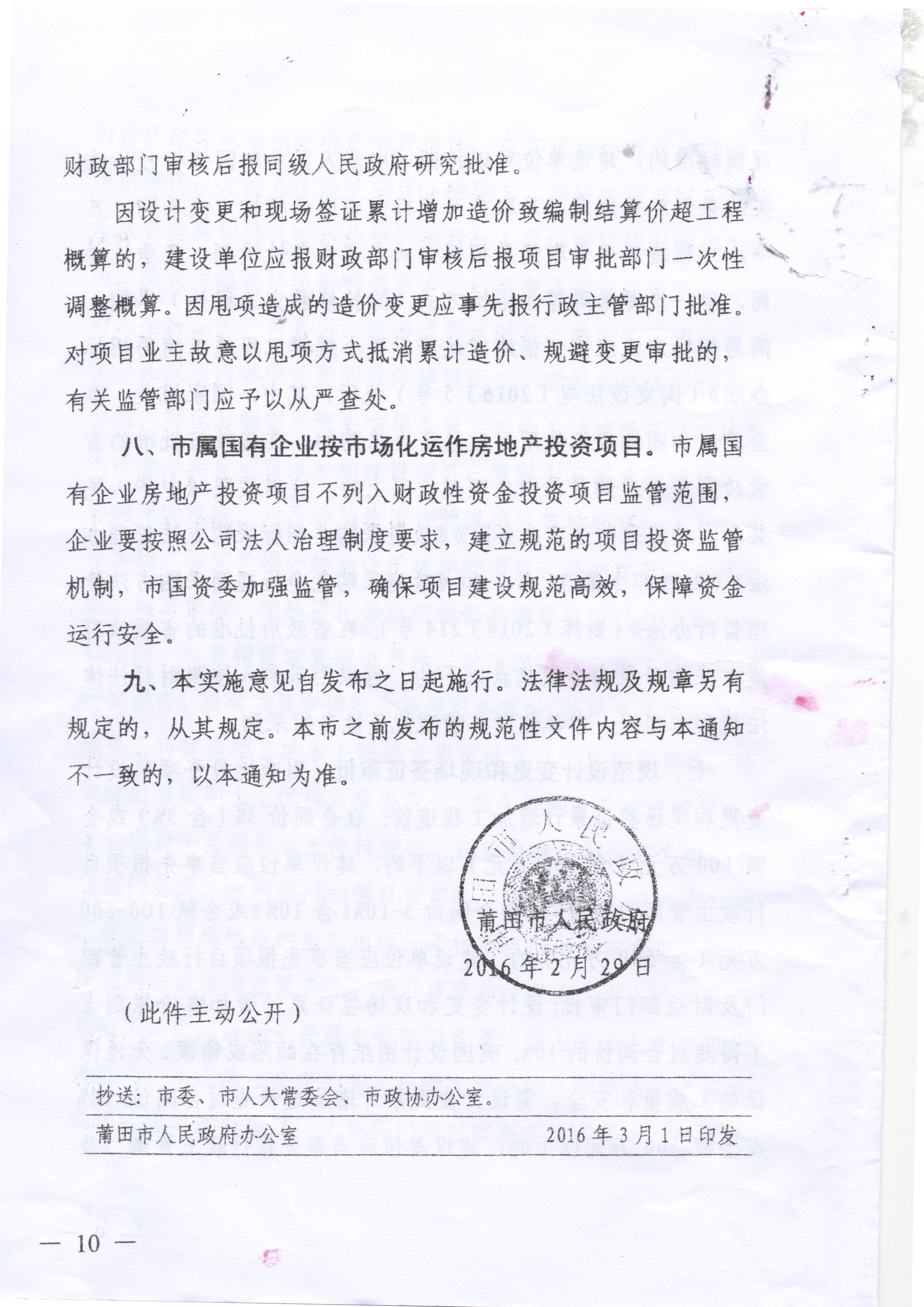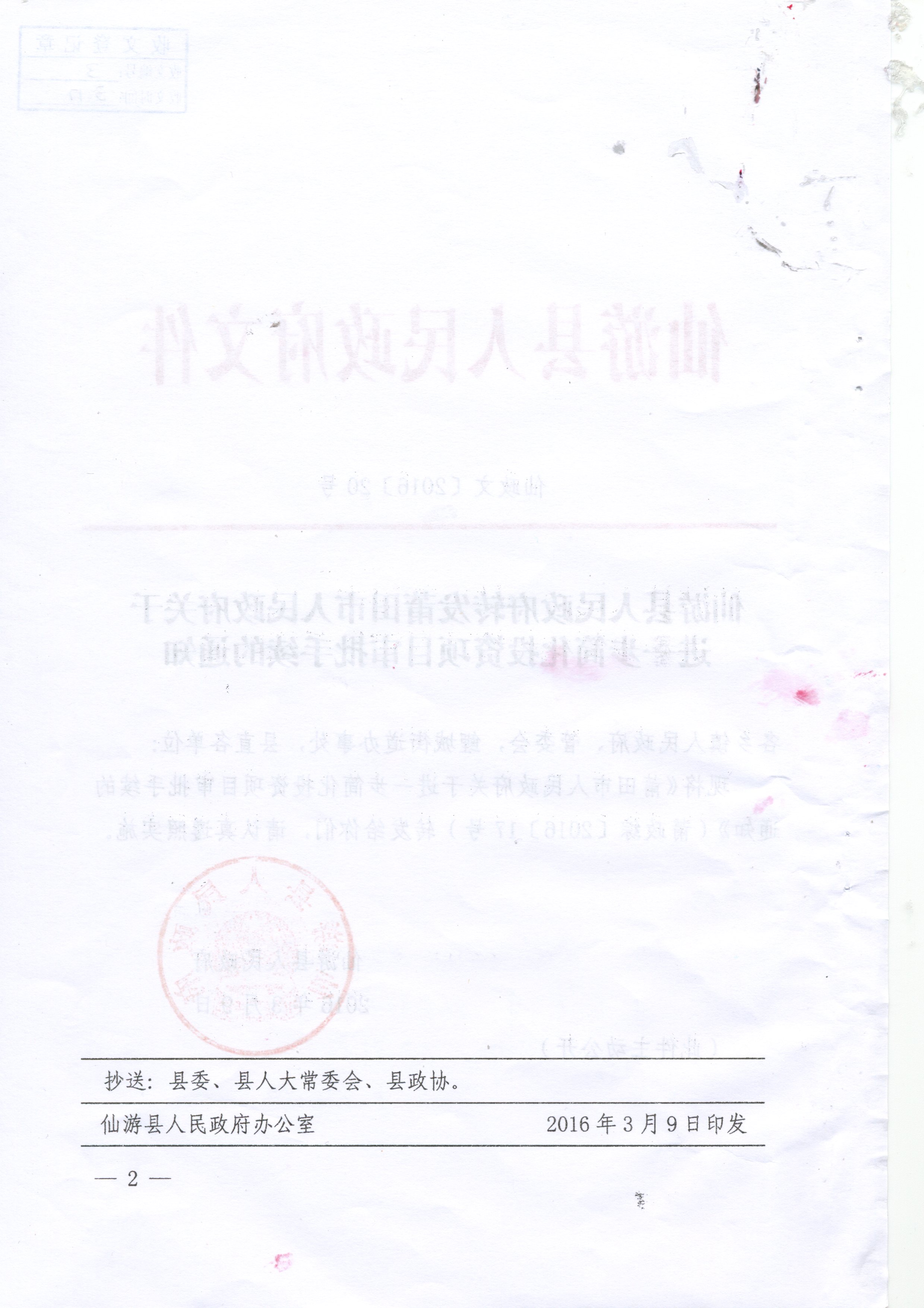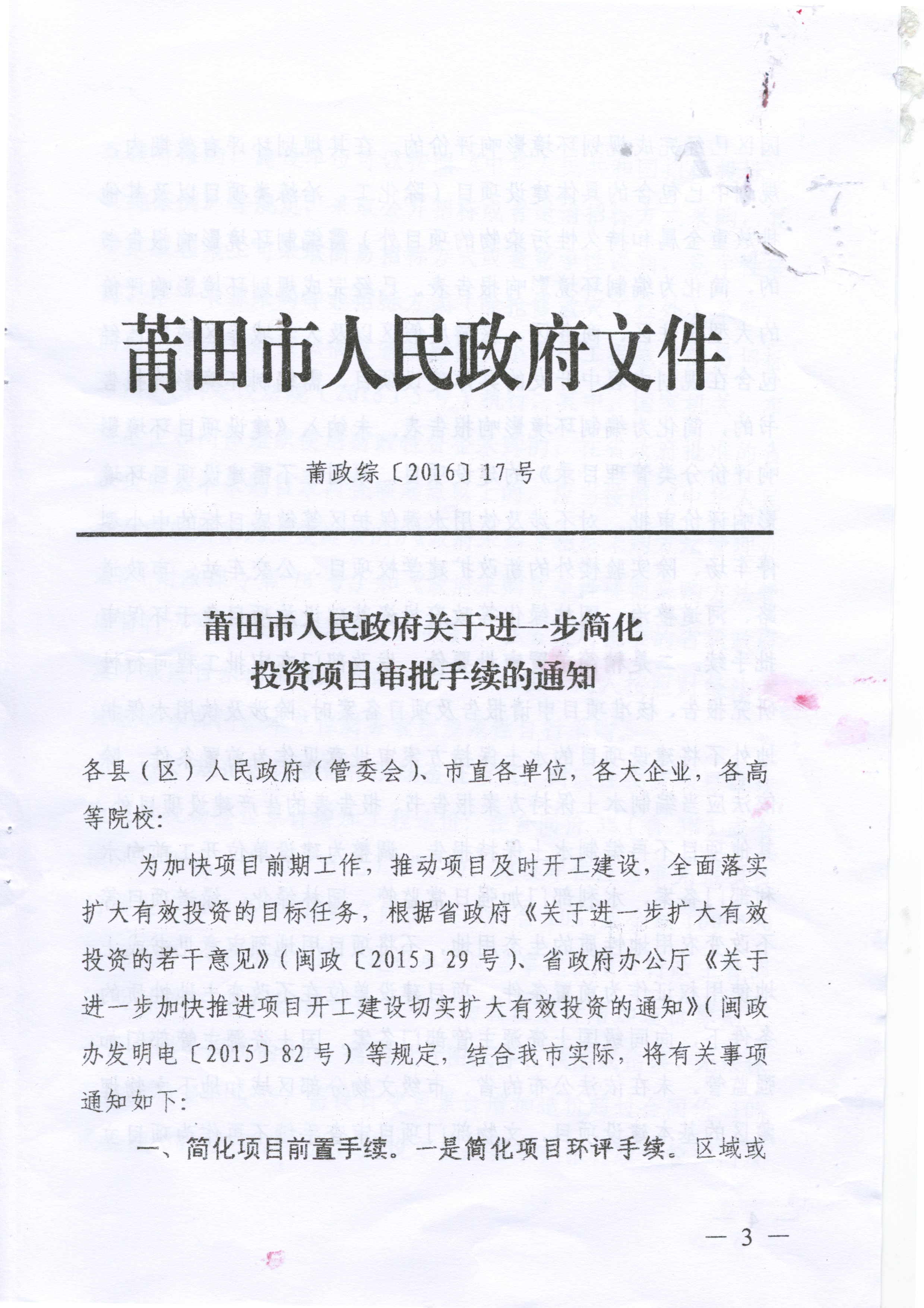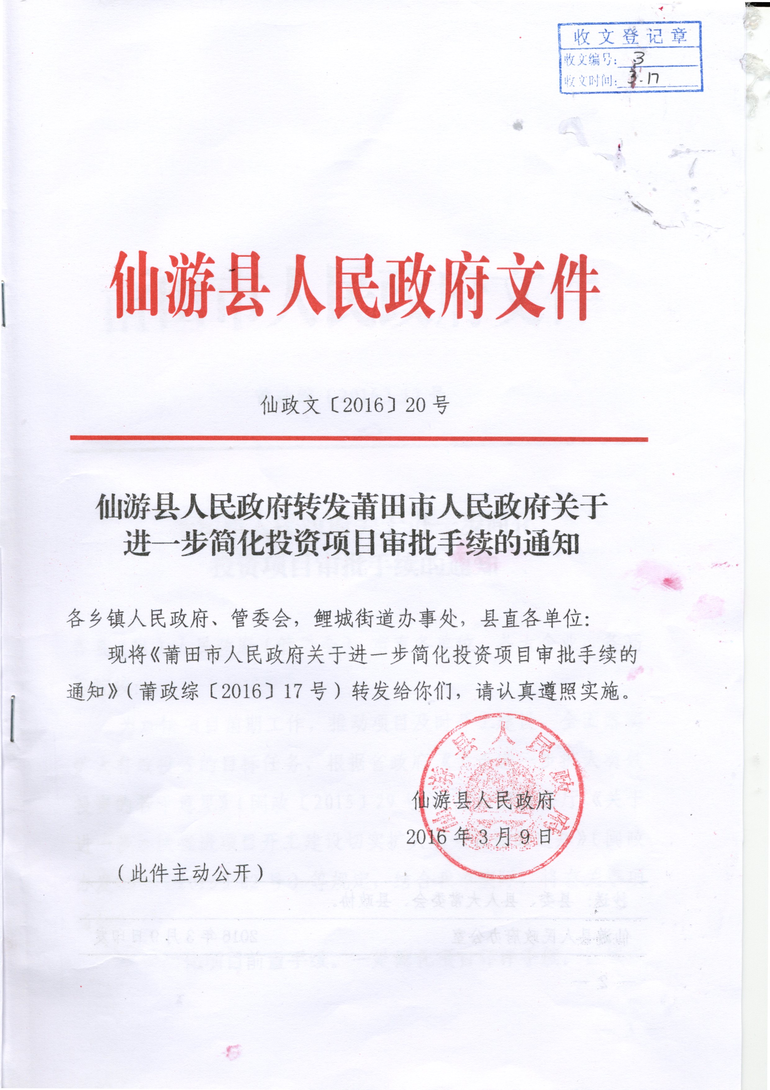 仙政文[2016]20号仙游县人民政府转发莆田市人民政府关于进一步简化投资项目审批手续的通知