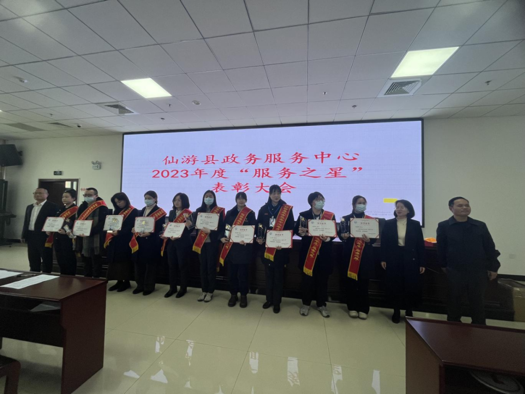 为持续深化“放管服”改革工作,强化服务意识,提高办事效率,2024年1月30日下午,仙游县政务服务中心召开2023年度“服务之星”表彰大会,中心负责人余炳忠、副主任陈绍杰、黄燕彬出席会议。本次会议从全体窗口工作人员中评选出十名为仙游县政务服务中心2023年度“服务之星”,会议对获奖窗口和个人进行了表彰,并颁发了奖杯和证书。