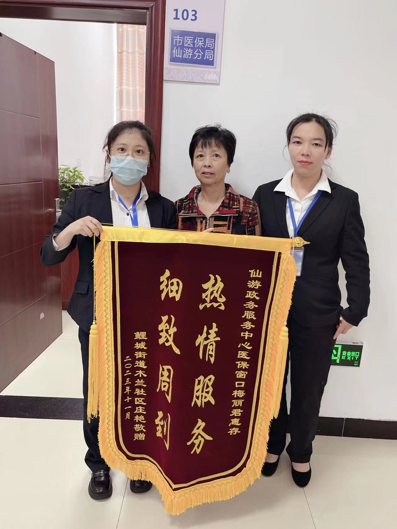 2023年11月13日群众庄艳专程将一面印着“热情服务,细致周到”的锦旗送至仙游县政务服务中心医保窗口。
